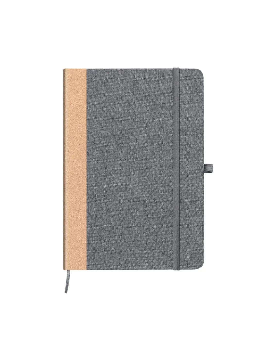 Bloc de notas con tapas rígidas fabricadas en RPET, con el lomo en corcho. Incluye interior con 80 hojas lisas, marcapáginas, elástico de cierre y...