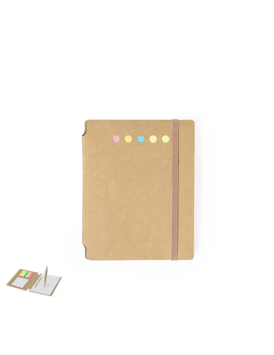 Bloc de notas elaborado en cartón reciclado. Incluye 70 hojas blancas con disposición a una raya, 15 notas adhesivas de 5x6,5 cm y 75 mininotas adhesivas de 1,2x4,5 cm en diversos colores. Además, cuenta con un bolígrafo fabricado en cartón reciclado y caña de trigo con mecanismo pulsador y tinta azul. Presentado individualmente en bolsa de papel. El cartón reciclado proviene del reaprovechamiento de excedente de fabricaciones y reciclaje de papel en el final de su vida útil, convirtiéndose en un lienzo ecológico y sostenible.
