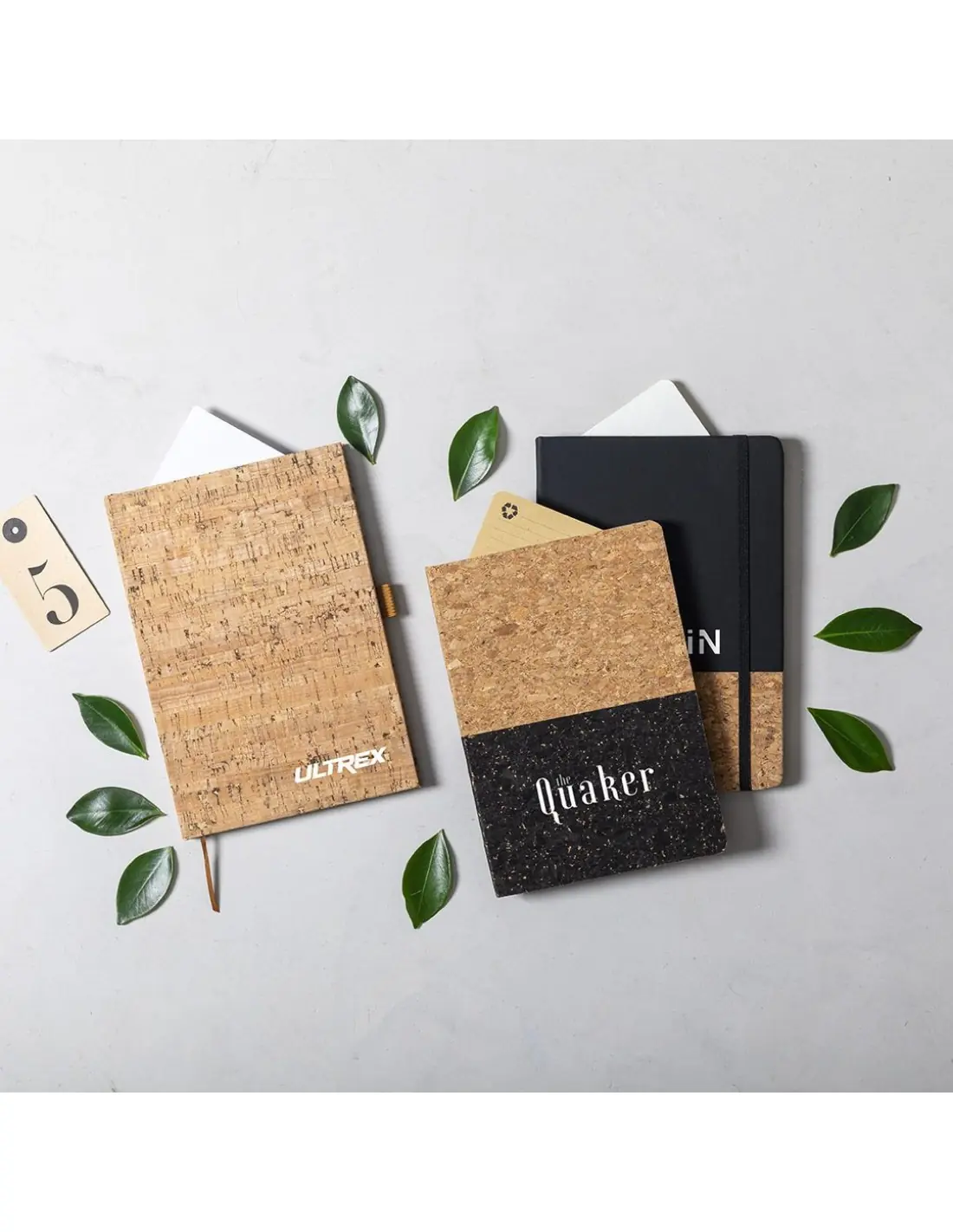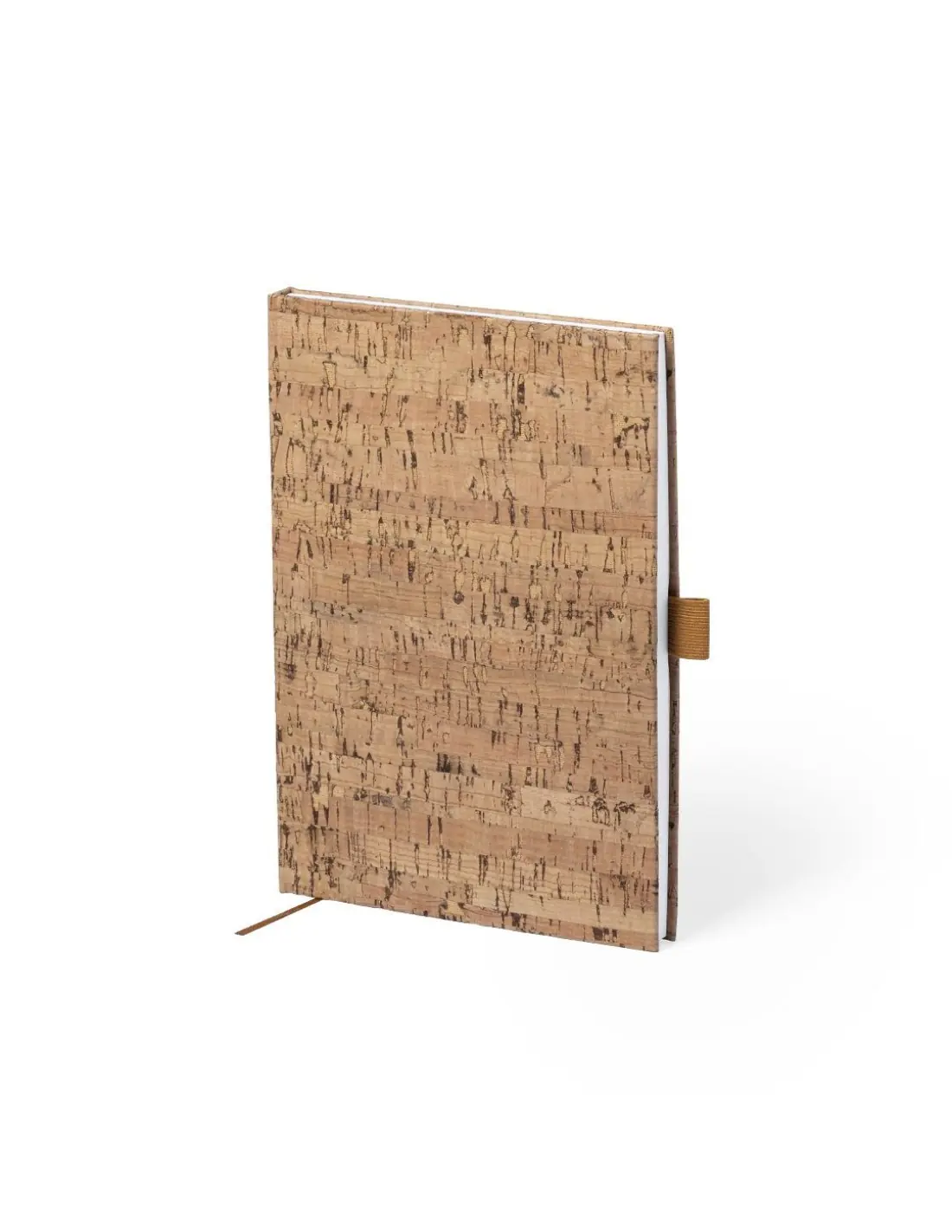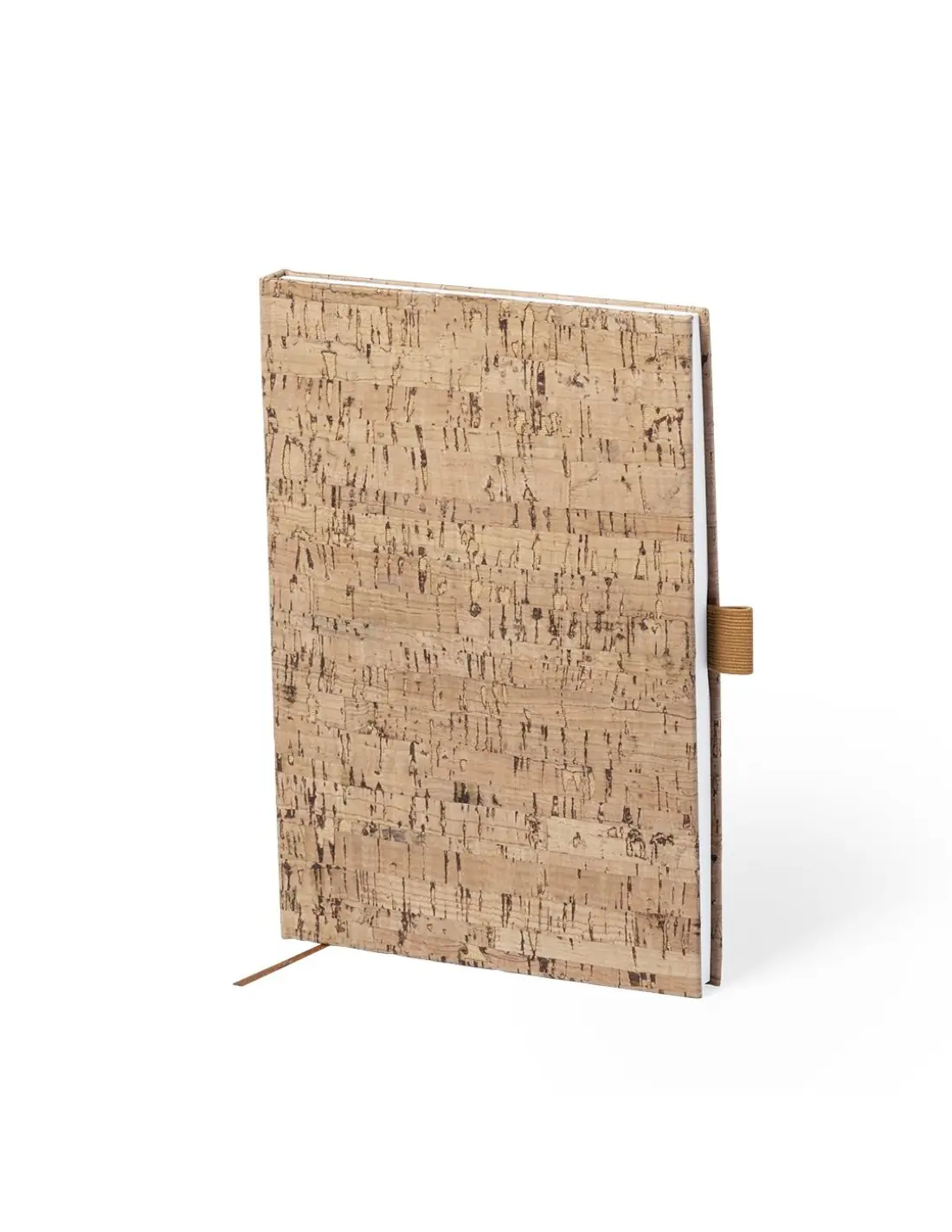 Bloc de notas de línea nature con tapas duras en corcho natural, de sobrio diseño. Incluye 100 hojas blancas lisas, con marcapáginas y soporte para bolígrafo a juego.
