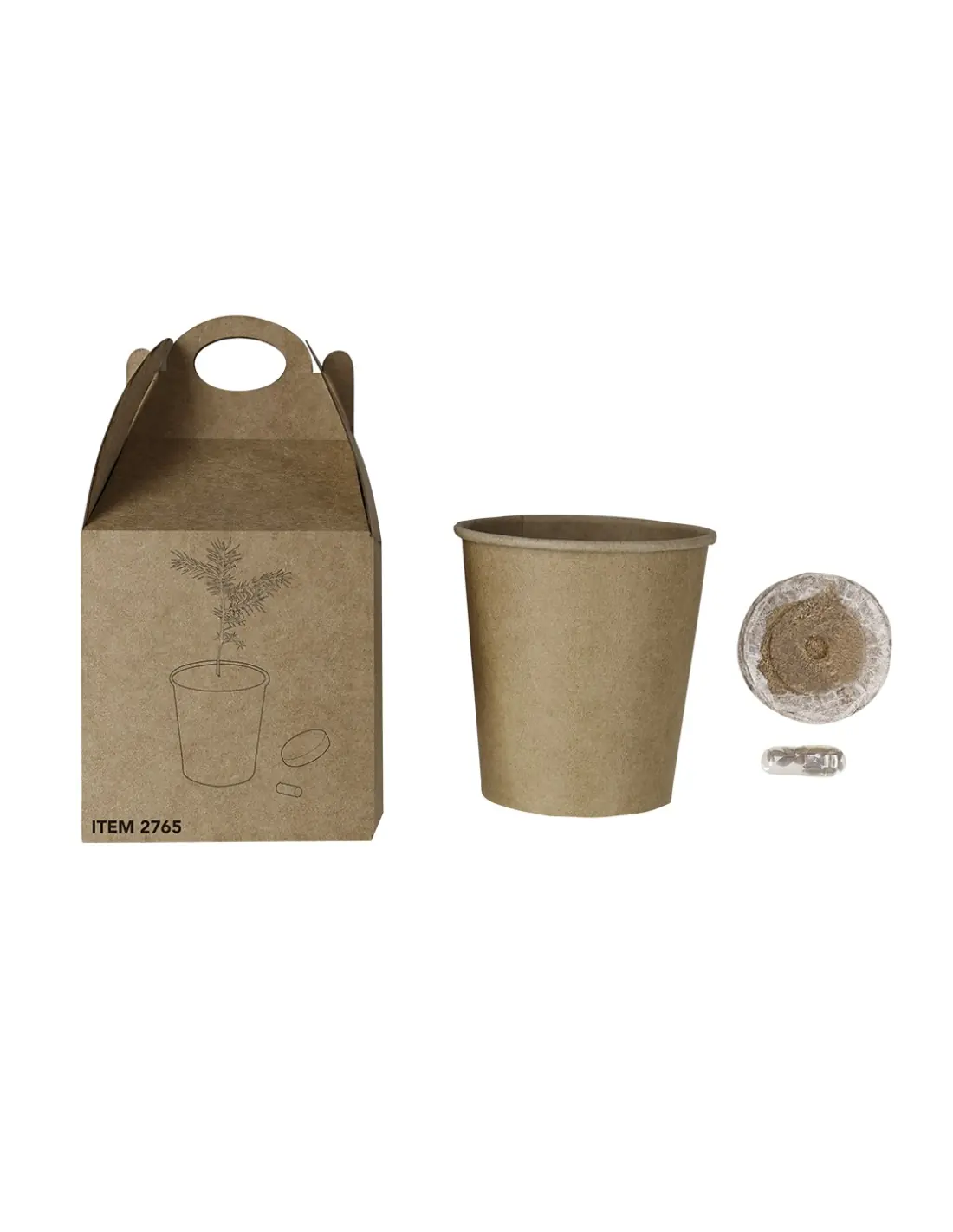 Maceta con semillas de pino. Incluye sustrato, tiesto de cartón reciclado y semillas de pino en una cápsula. Presentado en una original caja de cartón kraft con asa. Incluye instrucciones de plantado y distintivo.