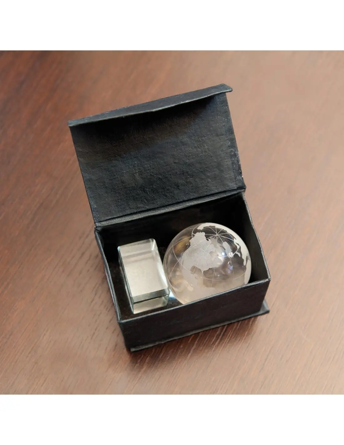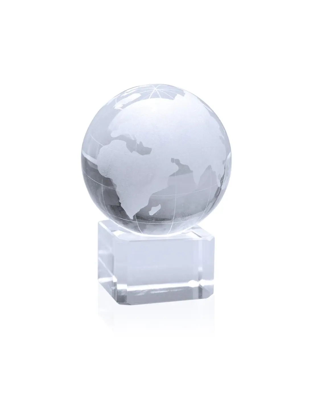 Bola de cristal con forma de planeta Tierra con base para marcaje en láser. Presentada en estuche de protección individual.