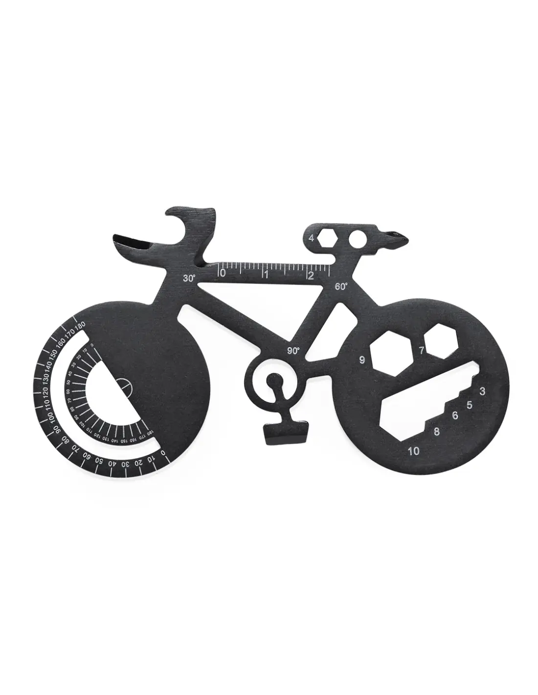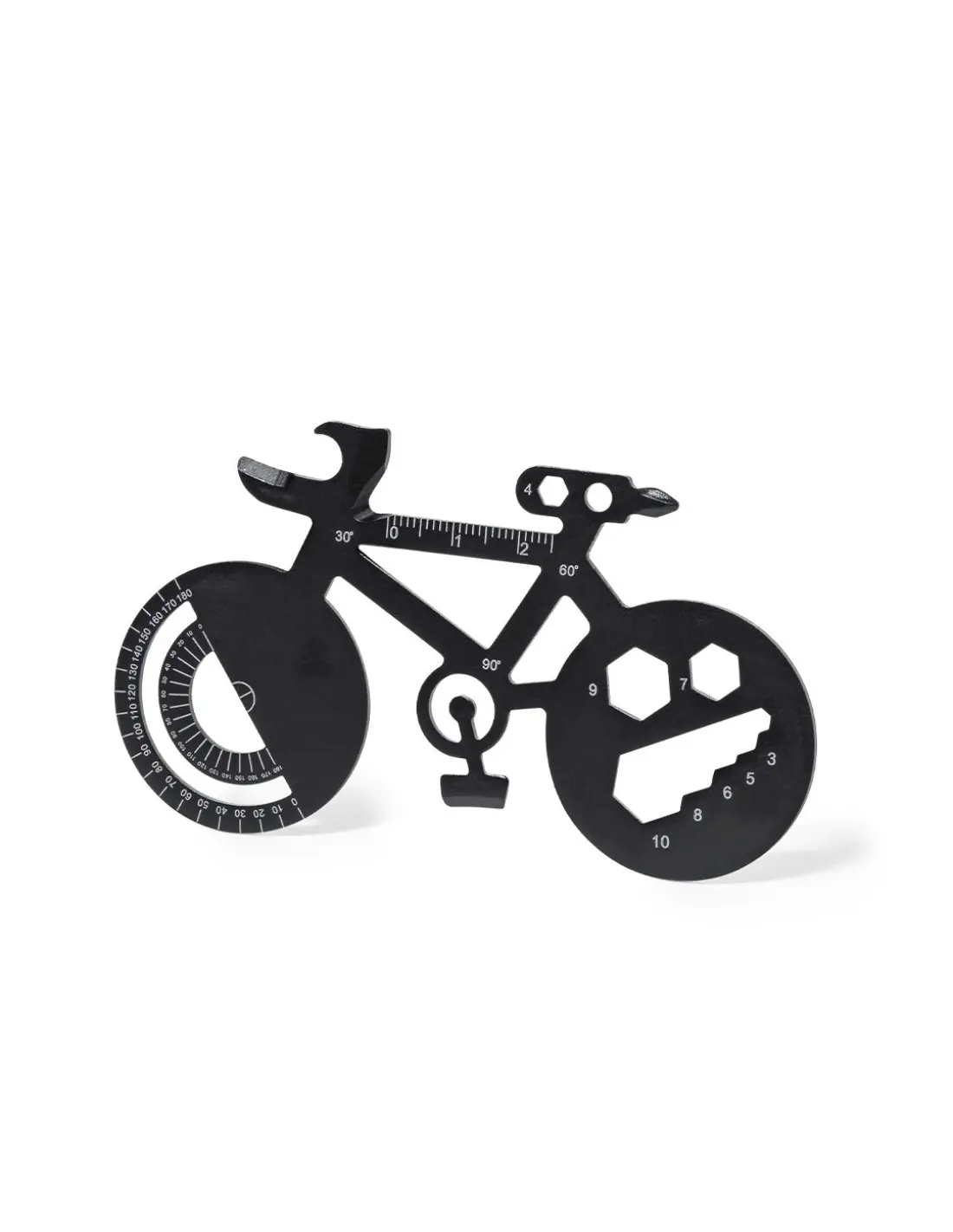 Original y práctica multiherramienta en acero inox con forma de bicicleta. Con 16 funciones, entre otras: destornillador de punta plana y philips, llave para tuercas hexagonales en varios tamaños, regla, transportador de ángulos y abrebotellas. Presentada en bolsa de papel reciclada.