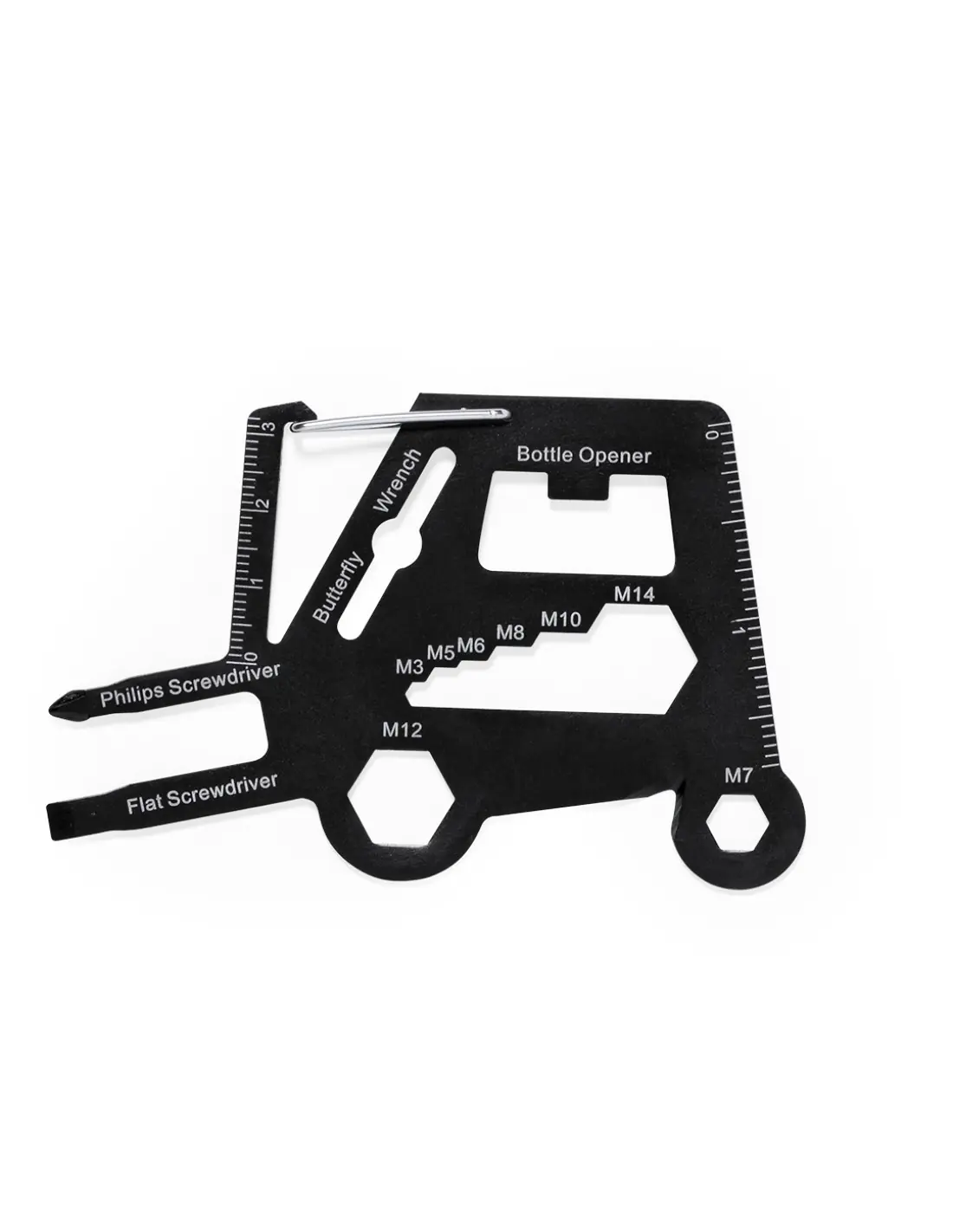 Original y práctica multiherramienta en acero inox con forma de toro mecánico. Con 16 funciones, entre otras: destornillador de punta plana y philips, llave para tuercas hexagonales en varios tamaños, regla, abridor de cajas y abrebotellas. Además de enganche en forma de mosquetón para un fácil transporte. Presentado en bolsa de papel reciclada.