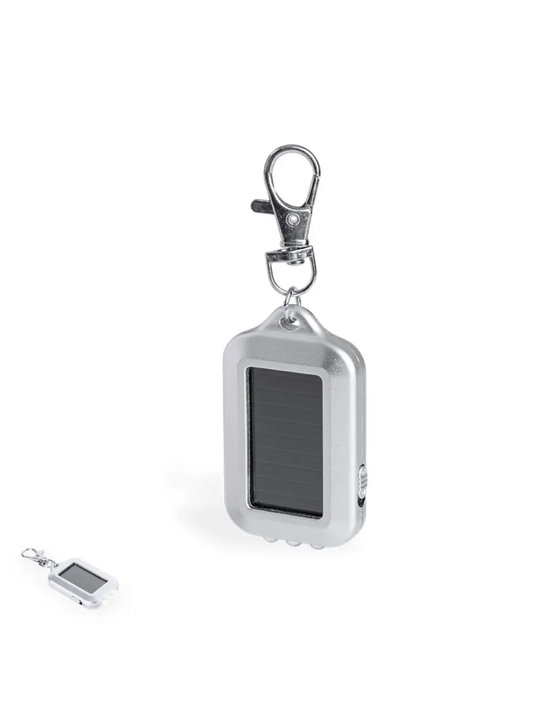 Práctico llavero linterna con carga solar, equipado con 3 luces LEDs y un botón lateral de encendido y apagado. Se recarga fácilmente gracias a su placa solar. Con gancho metálico giratorio para un cómodo transporte. Presentado en caja de diseño kraft.