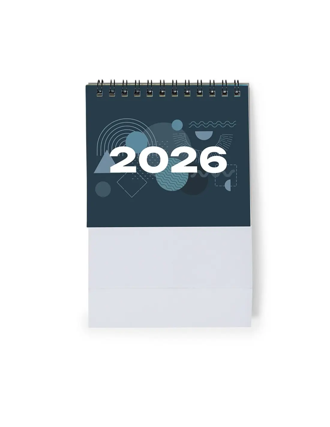 Calendario de sobremesa de anillas con cuerpo triangular en cartón. Diseño mes en curso/ mes anterior/ mes siguiente y santoral. Amplia superficie de marcaje en ambas caras.