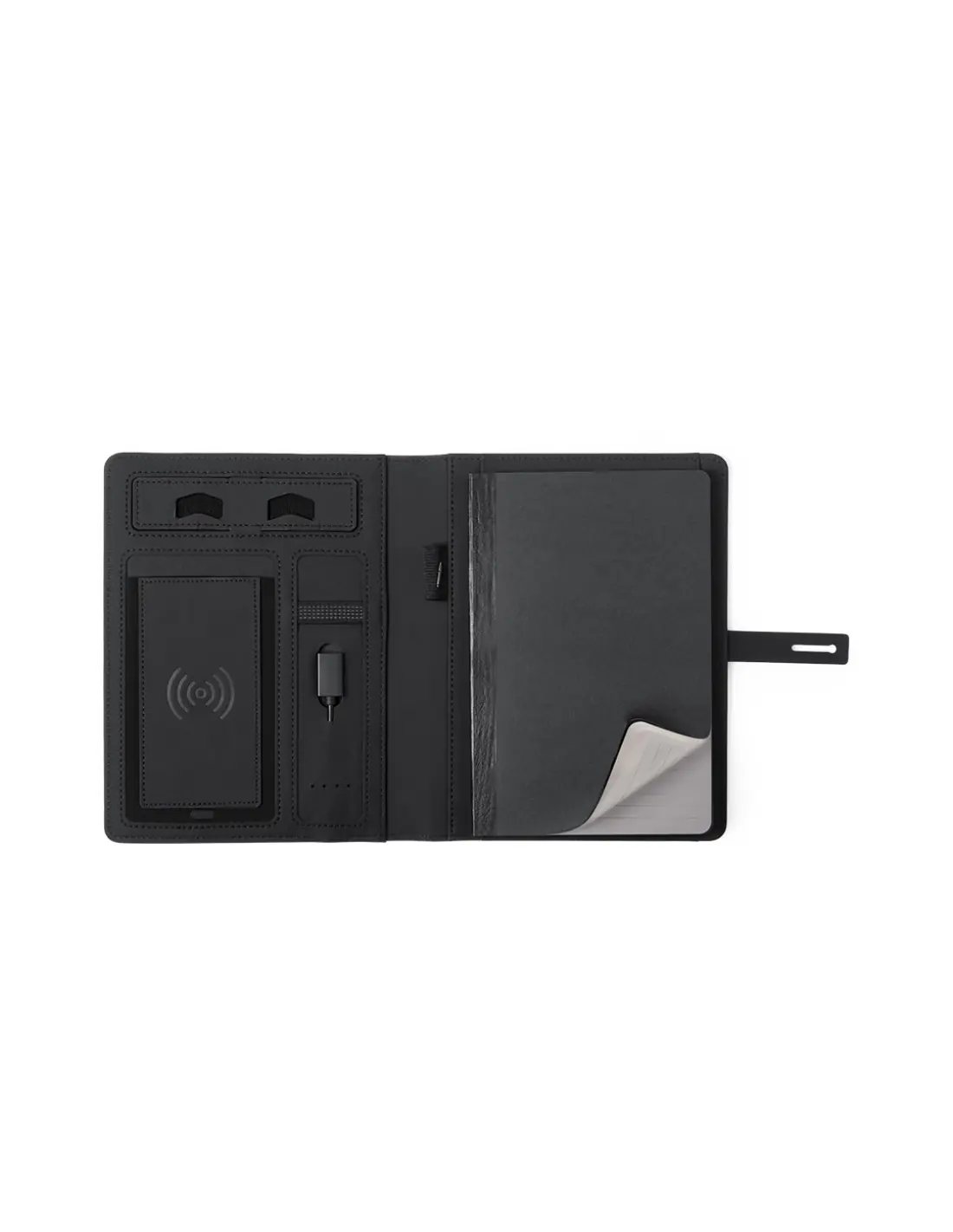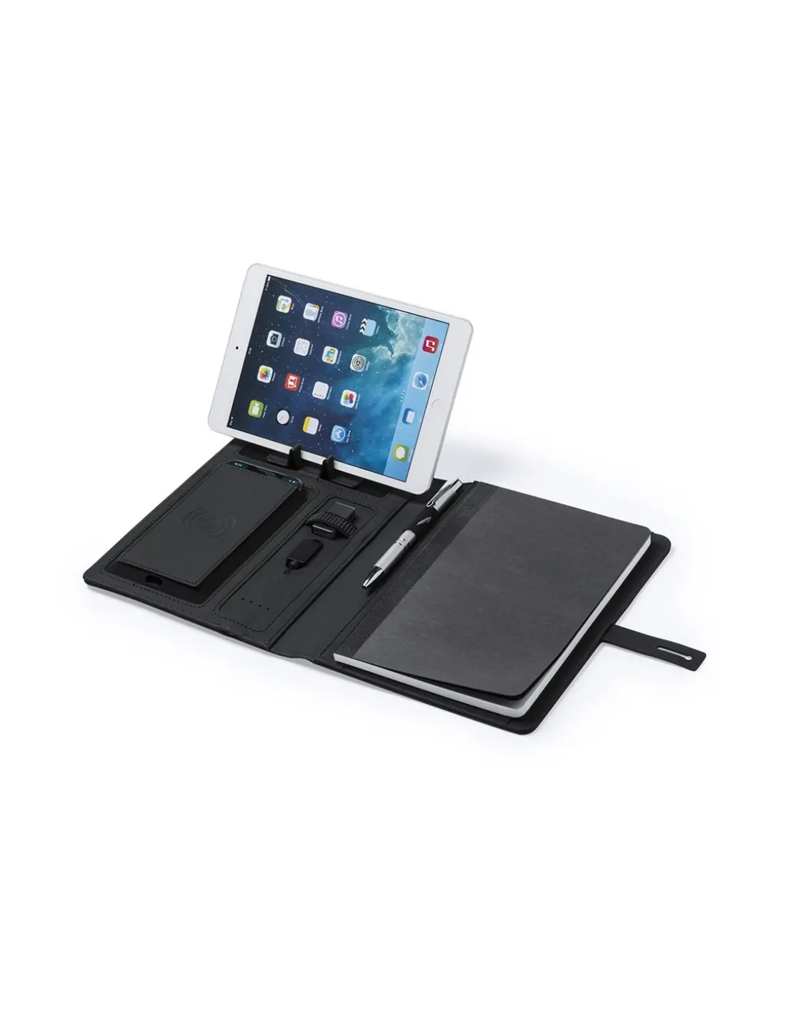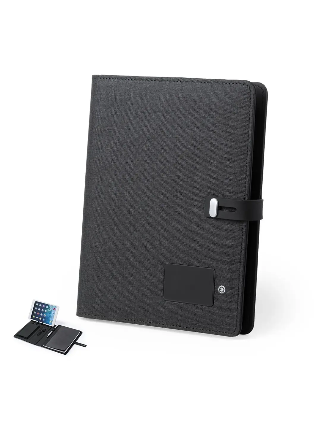 Elegante y práctico organizador en poliéster 300D. Con carga inalámbrica y batería auxiliar de 4.000 mAh de capacidad de carga integrada. De sobrio diseño y original cierre, incluye bloc de notas de 64 hojas, soporte para bolígrafo e indicador led de estado de carga. El fácil acceso a la estación de carga mediante cable micro USB -incluido- hacen de este organizador el gadget perfecto para el mundo de los negocios. Las capacidades mostradas en todas nuestras baterías auxiliares externas son reales, incorporando todas ellas baterías de grado A y no recicladas, con una vida útil de al menos 500 ciclos de carga y según normativa CE. Además, están fabricadas conforme a los estándares RoHS y en cumplimiento con los siguientes requisitos de seguridad: Sistema de protección contra sobrecarga del power bank. Sistema de protección contra descarga completa que proporciona una mayor durabilidad del power bank. Sistema de bloqueo para evitar cortocircuitos. Sistema de transferencia de carga constante, acorde con la capacidad del dispositivo de destino.