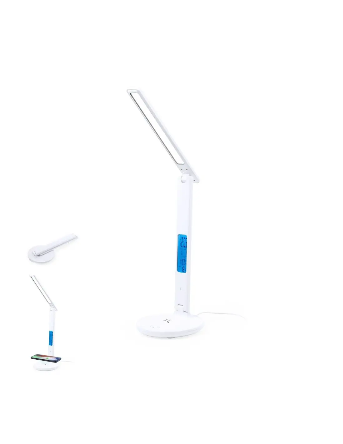 Lámpara multifunción plegable todo en uno, fabricada en resistente ABS blanco con acabado imitación piel. Provisto de 60 LEDs y 3 posiciones de iluminación (cálida, fría y media), con intensidad de luz regulable mediante el botón táctil de la base. Extensible y fácil de orientar, con pantalla de LCD integrada y retroiluminada, que marca hora, fecha, día y temperatura. Con botones de ajuste en la parte trasera y pila de botón incluida para guardar los datos. Incluye un cargador inalámbrico 10W integrado en la base, con entrada Tipo C y compatible con dispositivos móviles de carga inalámbrica. Con cable cargador Tipo C, y manual de instrucciones en español e inglés. Presentada en una atractiva caja de diseño kraft.