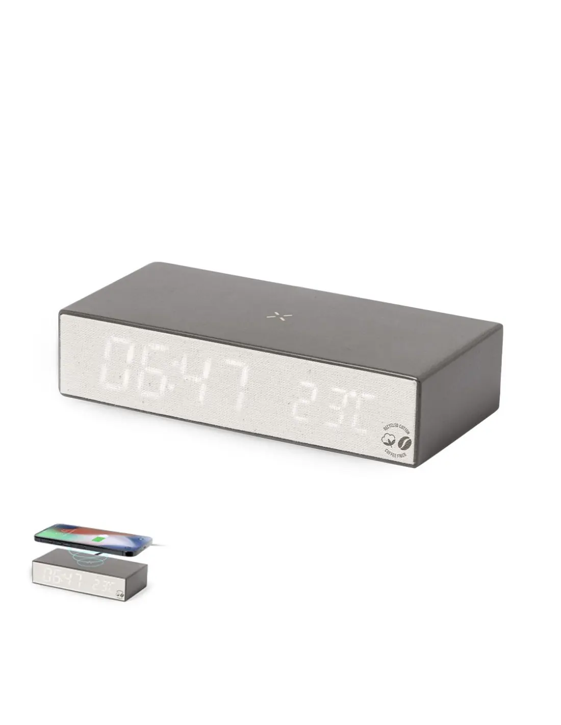 Reloj multifunción con cargador inalámbrico 10W integrado. Fabricado en en fibra de café y algodón reciclado. Función hora (12/24h), alarma, con intensidad de luz regulable. Alimentación mediante conexión USB. Compatible con dispositivos equipados con tecnología de carga inalámbrica y presentado en atractiva caja de diseño kraft. Con distintivo de fibra de café y algodón reciclado. Incluye manual de instruccions en español e inglés.La fibra de café es una solución circular que se obtiene de la utilización de los residuos producidos en la obtención del café. Una alternativa sostenible que favorece la reducción del uso de plásticos, ahorrando energía en su proceso de fabricación y contribuyendo al cuidado del medio ambiente.Disponible certificación GRS (Global Recycled Standard / Estándar de Reciclaje Global), que garantiza el origen reciclado del material usado para fabricar el producto.