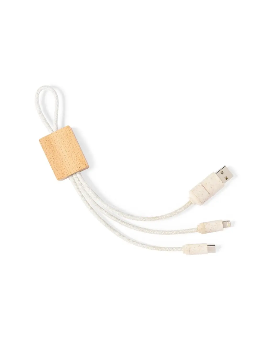 Cable cargador con cinta de transporte. Fabricado usando materiales naturales y respetuosos con el medio ambiente: Pieza central en madera natural. Cables recubiertos en cáñamo orgánico, obtenido de la planta cannabis, cuyos procesos tanto de cultivo como de obtención de fibras, son respetuosos con el medio ambiente, dando como resultado un material de gran resistencia, de origen natural y sostenible. Fundas de conectores en caña de trigo, para así fomentar la utilización de materias primas naturales y reducir las emisiones contaminantes.Incluye conexiones de entrada Tipo C y USB, salidas Lightning, Micro USB y Tipo C. 5V DC 2.4A. Presentado en bolsa individual de diseño kraft.