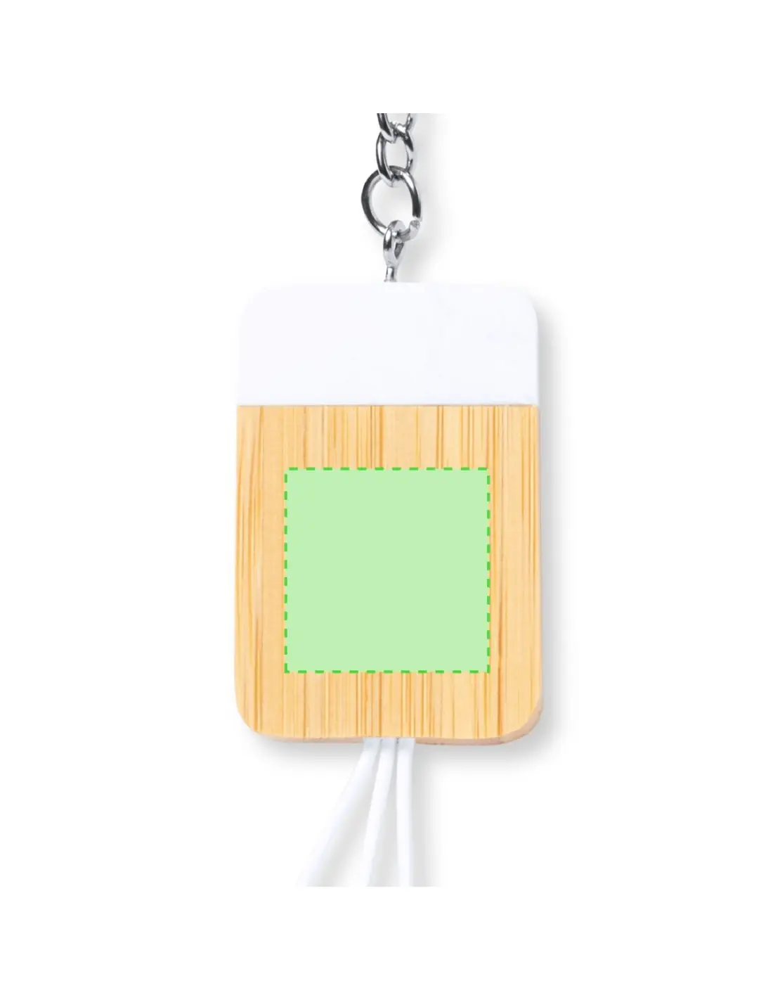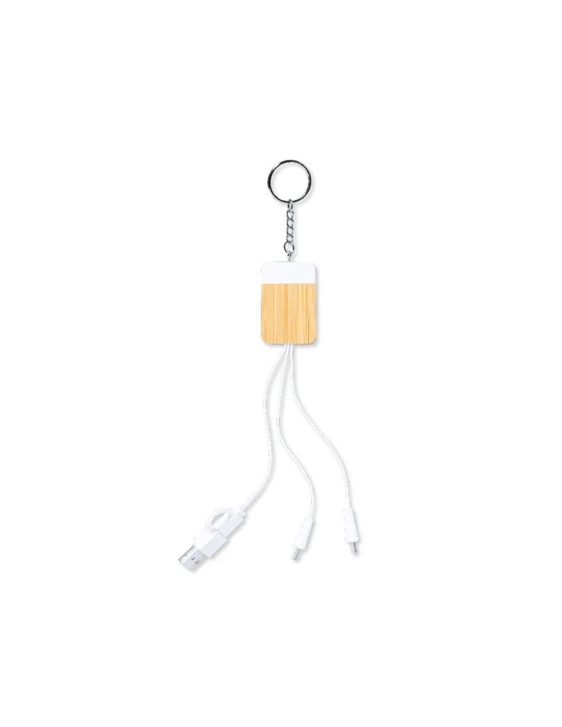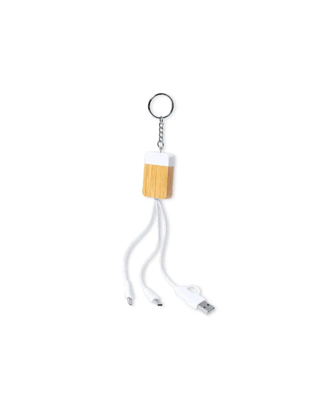 Cable cargador con llavero, fabricado en bambú y con detalle en extracto de mármol. Incluye conexiones de entrada USB y Tipo C, con salidas...