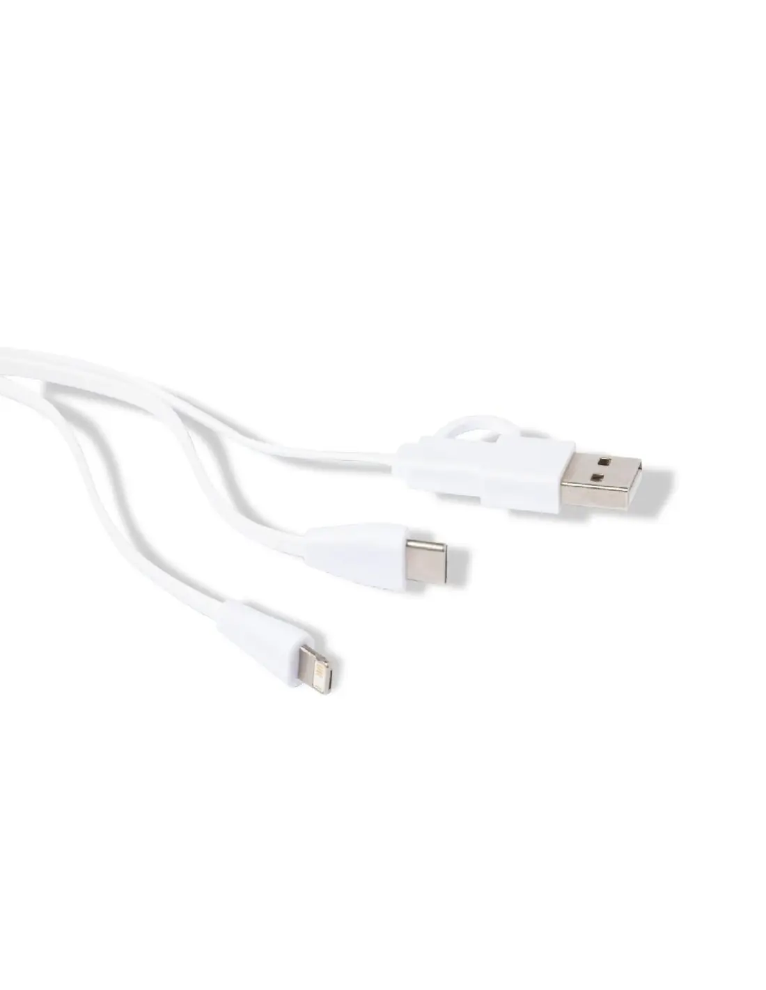 Cable cargador con llavero, fabricado en bambú y con detalle en extracto de mármol. Incluye conexiones de entrada USB y Tipo C, con salidas Lightning, Micro USB y Tipo C 5VDC 2.4A. Presentado en bolsa individual de diseño kraft.
