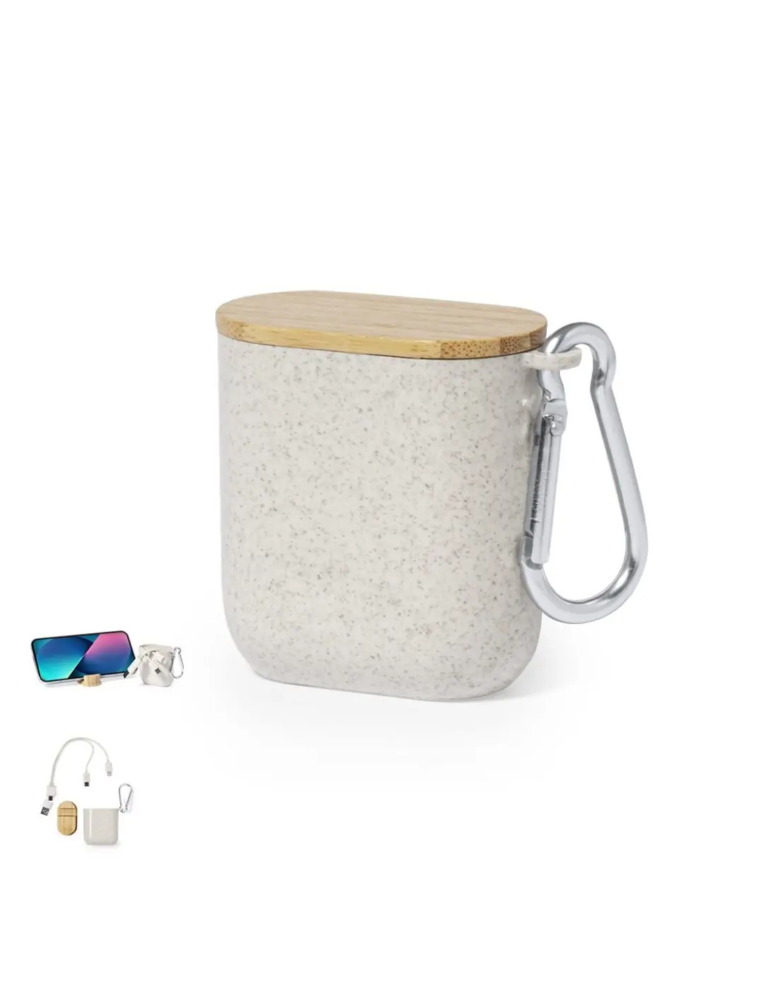 Cable cargador fabricado en fibra de trigo. Con conexiones de entrada Tipo C y USB y salidas Tipo C, Lightning y Micro USB. 5V DC 2.4A. Presentado en elegante estuche de diseño fabricado en fibra de trigo y tapadera de cierre en bambú, con función soporte para smartphones. Elaborado con elementos vegetales para así fomentar la utilización de materias primas naturales y reducir las emisiones contaminantes.