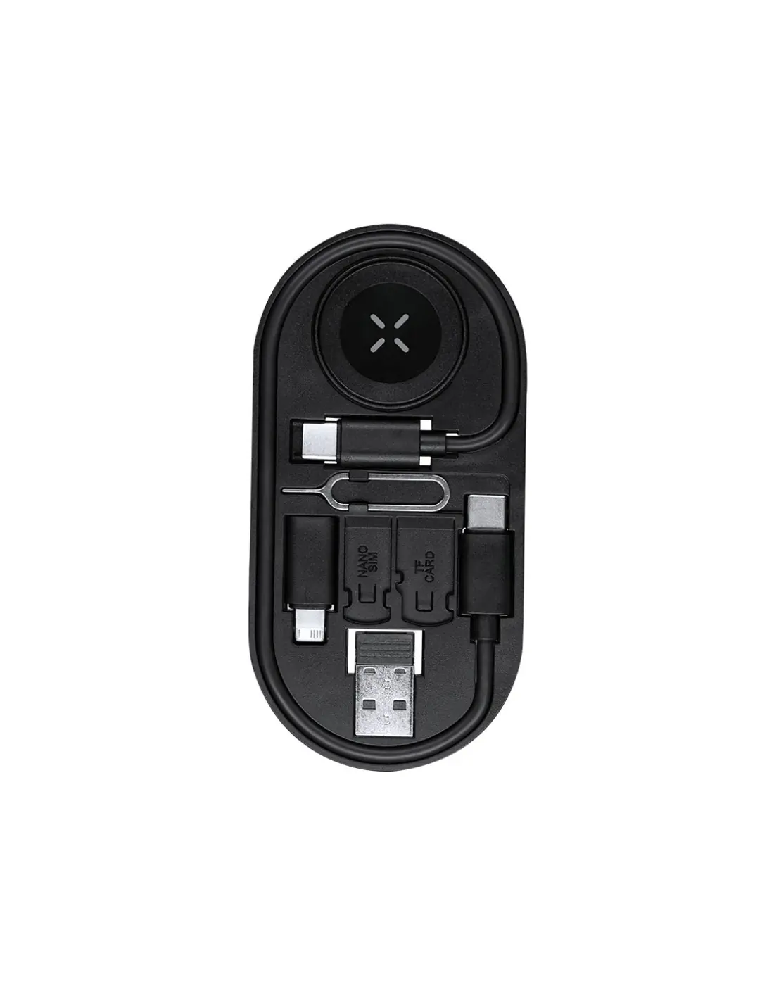 Set de cables cargadores en ABS Reciclado (RABS). Incluye:- Carga inalámbrica para smartwatch,.- Cable multifunción con cabezales USB, Tipo-C y Lightning, compatible con una amplia variedad de dispositivos y con capacidad de transferencia de datos.- Pin eyector de SIM, con ranuras para almacenamiento de Nano SIM y tarjetas TF.El RABS es un plástico altamente reciclable de gran resistencia y con multitud de aplicaciones que lo convierten en una solución eco-friendly. Con certificación RCS, que garantiza el origen reciclado del mismo y con logo RABS grabado.