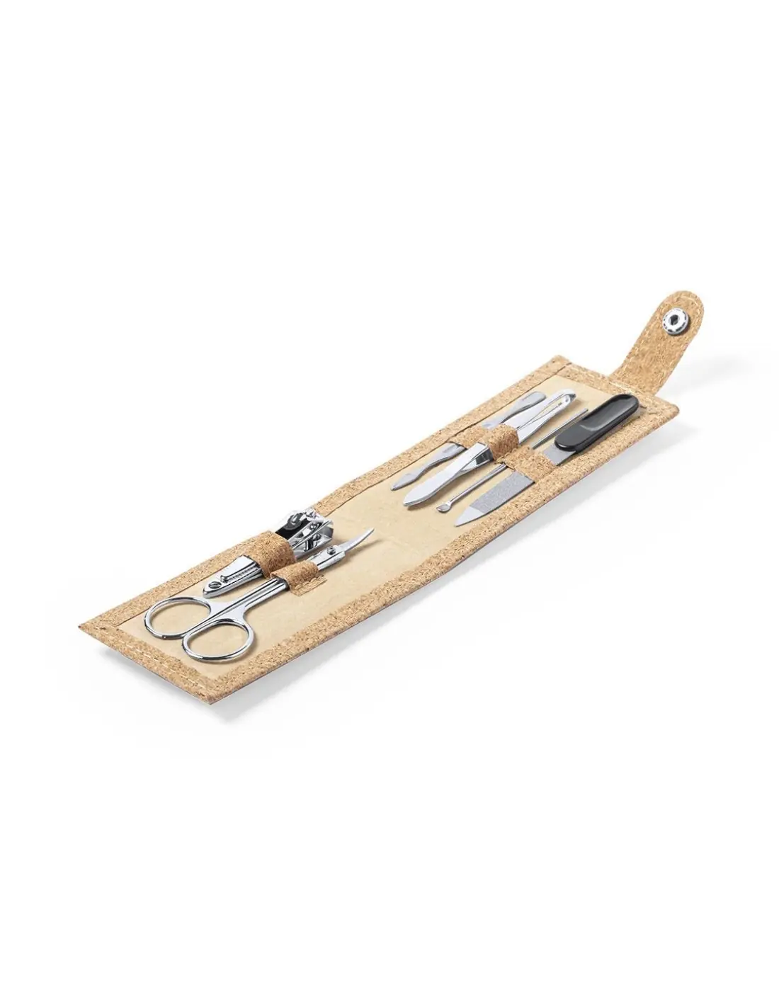Set de manicura de línea nature con funda fabricada en corcho, para así fomentar la utilización de materias primas naturales y reducir las emisiones contaminantes. Incluye 6 accesorios de acero inox: tijeras, pinzas, cortaúñas, lima y 2 quitacutículas. Soportes interiores para accesorios y cierre de corchete. Totalmente desplegable para fácil marcaje.