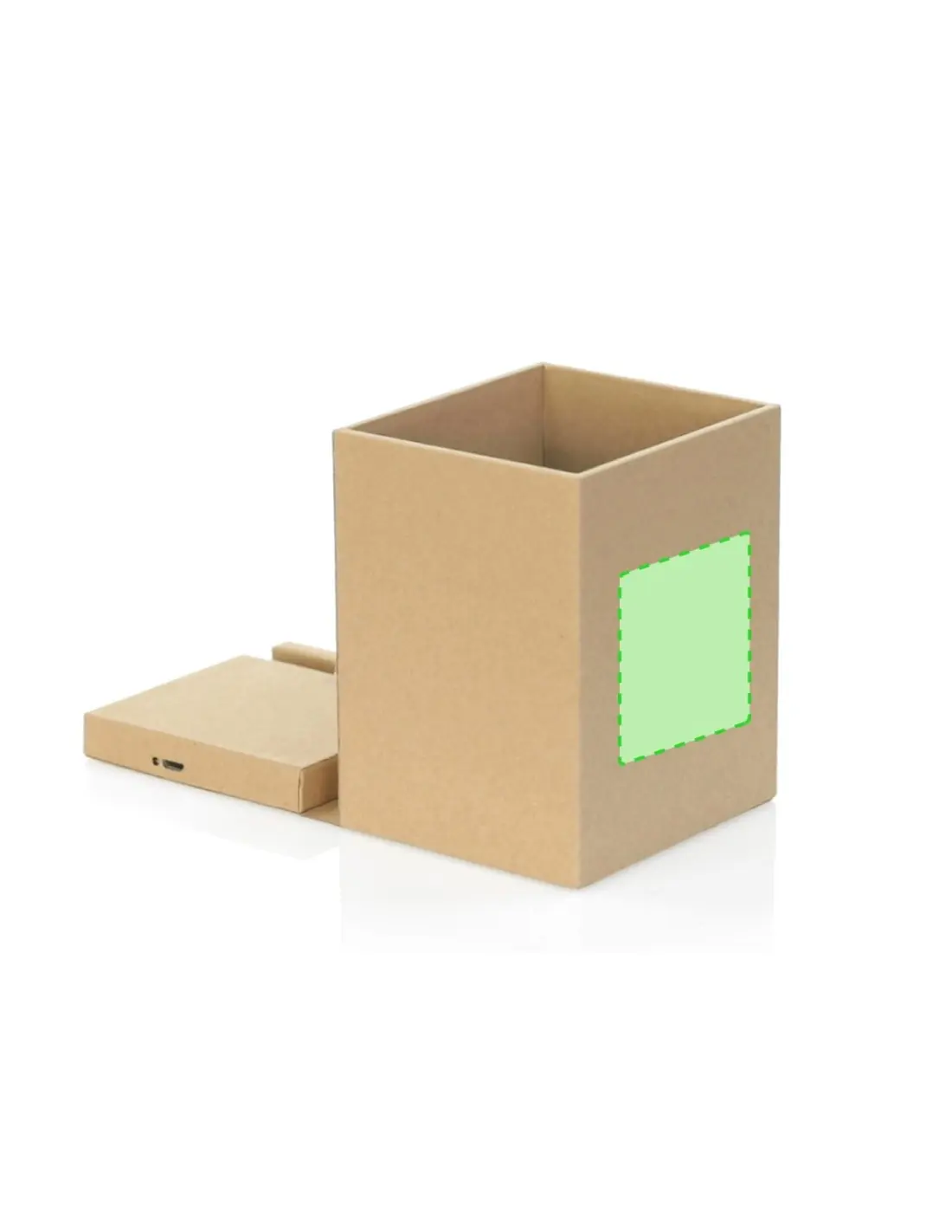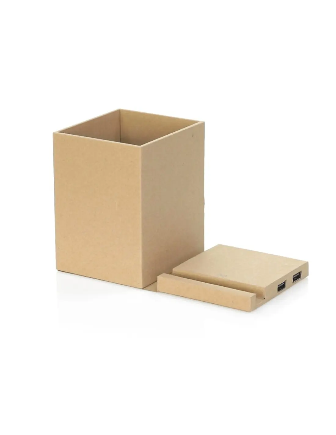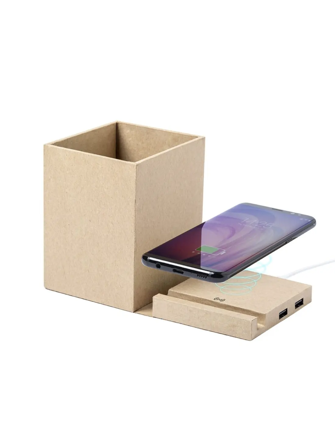 Lapicero multifunción 4 en 1 de línea nature fabricado en cartón reciclado, contribuyendo a la conservación de los bosques y reduciendo considerablemente la huella de carbono. Con funciones lapicero, soporte para smartphone, cargador inalámbrico y puerto USB (2xUSB 2.0). Diseño plegable con ajuste magnético. Compatible con smartphones con tecnología de carga inalámbrica. Incluye cable micro USB en color blanco de 1 metro de largo. Presentado en atractiva caja de diseño eco, con manual de instrucciones en español e inglés.