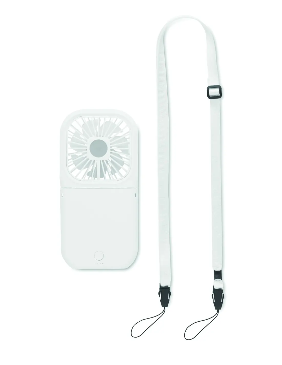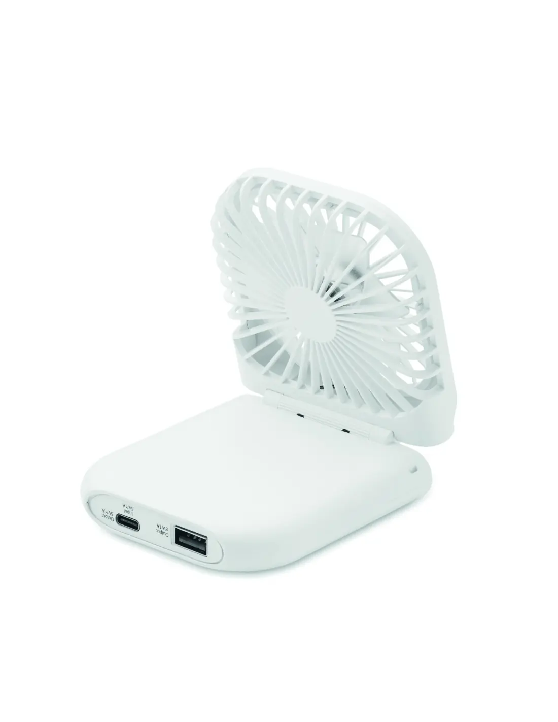 Ventilador portátil plegable con correa ajustable para el cuello. 3 velocidades. También se puede utilizar como ventilador de escritorio cuando está plegado. Power bank con batería recargable de 3000 mAh. In/Output: Tipo-C <(>&<)> output tipo A.