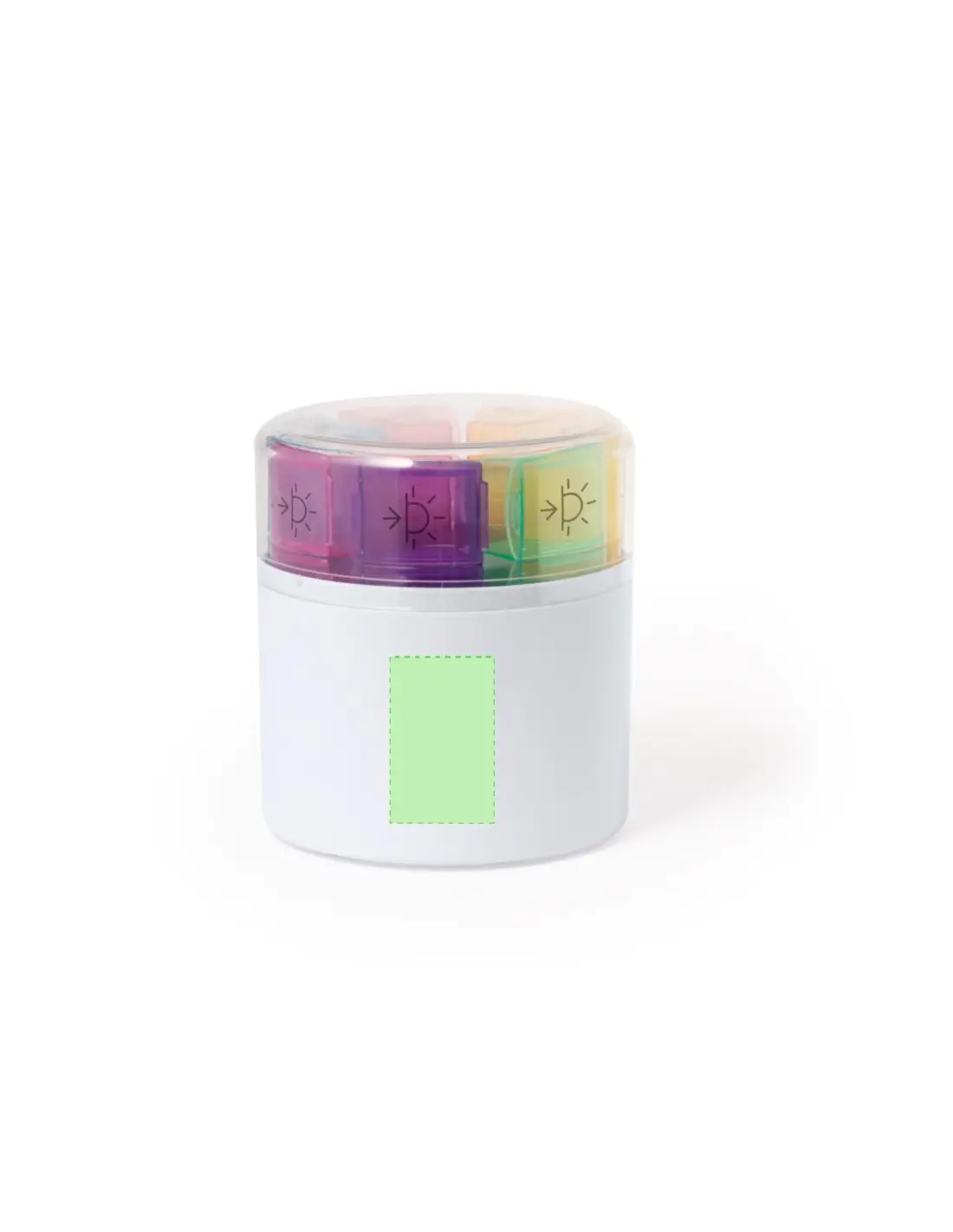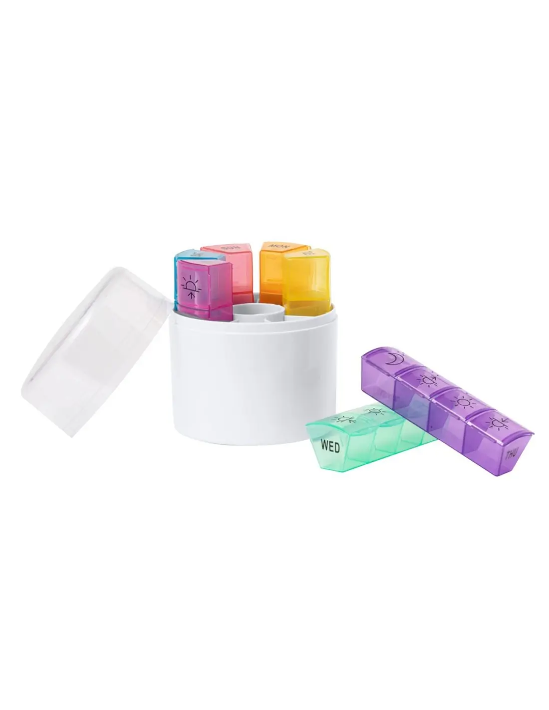 Compacto pastillero semanal. Estuche en forma de cilindro con 7 compartimentos diferenciados por colores y siglas para identificar rápidamente el día de la semana. Cada compartimento está dividido en 4 casillas independientes correspondientes a cada parte del día. Presentado individualmente en bolsa reciclada.