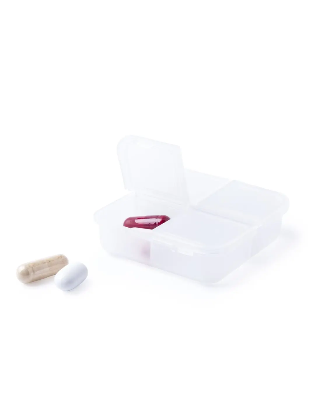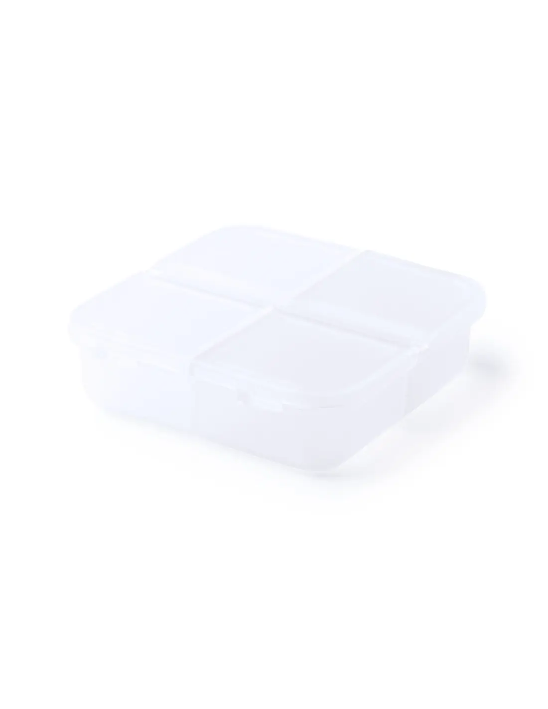 Pastillero de 4 compartimentos en material ABS de acabado translúcido y libre de BPA. Con tapa individual por compartimento.