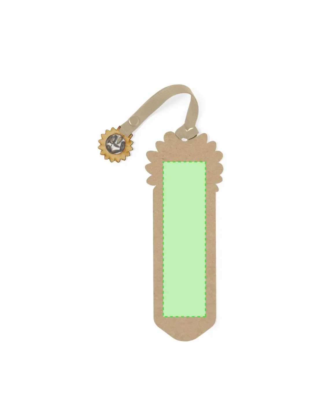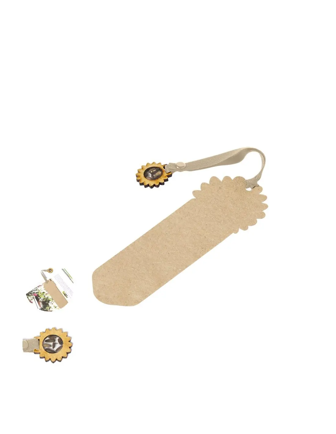 Práctico marcapáginas elaborado en cartón reciclado, con un diseño en forma de flecha y un cordón negro que facilita la búsqueda. En el extremo del cordón, incorpora una original cápsula con semillas de girasol.El cartón reciclado proviene del reaprovechamiento de excedente de fabricaciones y reciclaje de papel en el final de su vida útil, convirtiéndose en un lienzo ecológico y sostenible.