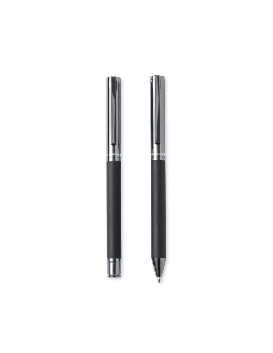 Set de bolígrafo y roller de Antonio Miró. Incluye: Bolígrafo metálico con cuerpo en negro mate. Detalles y capucha en cromado con logotipo de la...
