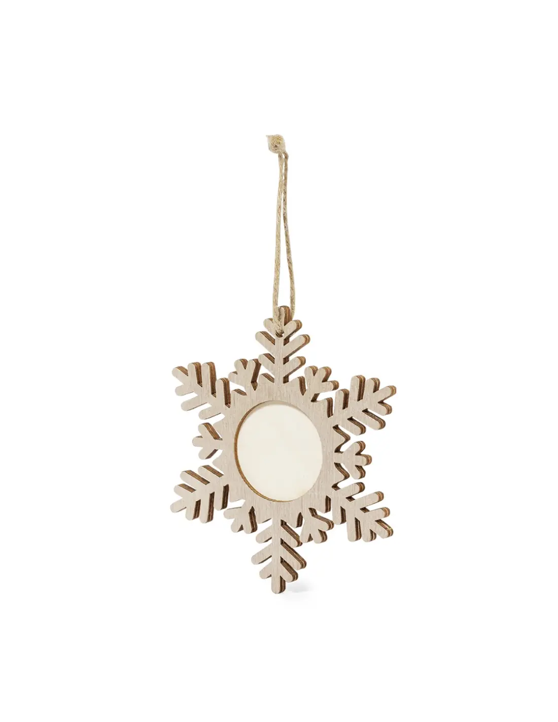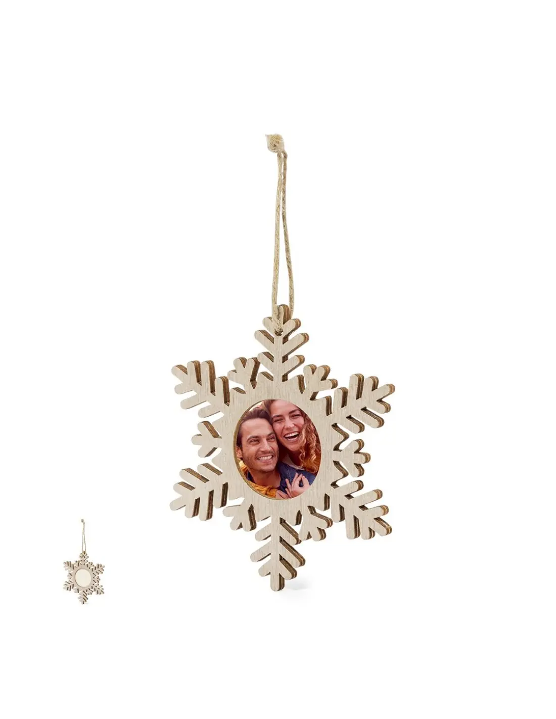 Elegantes adornos navideños con portafotos fabricados en suave madera. Incluye ventana para fotografías en tamaño 4x4 cm y accesorio para colgar en yute natural. Disponible en 3 originales diseños: Copo de Nieve, Árbol de Navidad y Estrella. Presentado en bolsa individual reciclada.Elaborado con elementos vegetales para así fomentar la utilización de materias primas naturales y reducir las emisiones contaminantes.