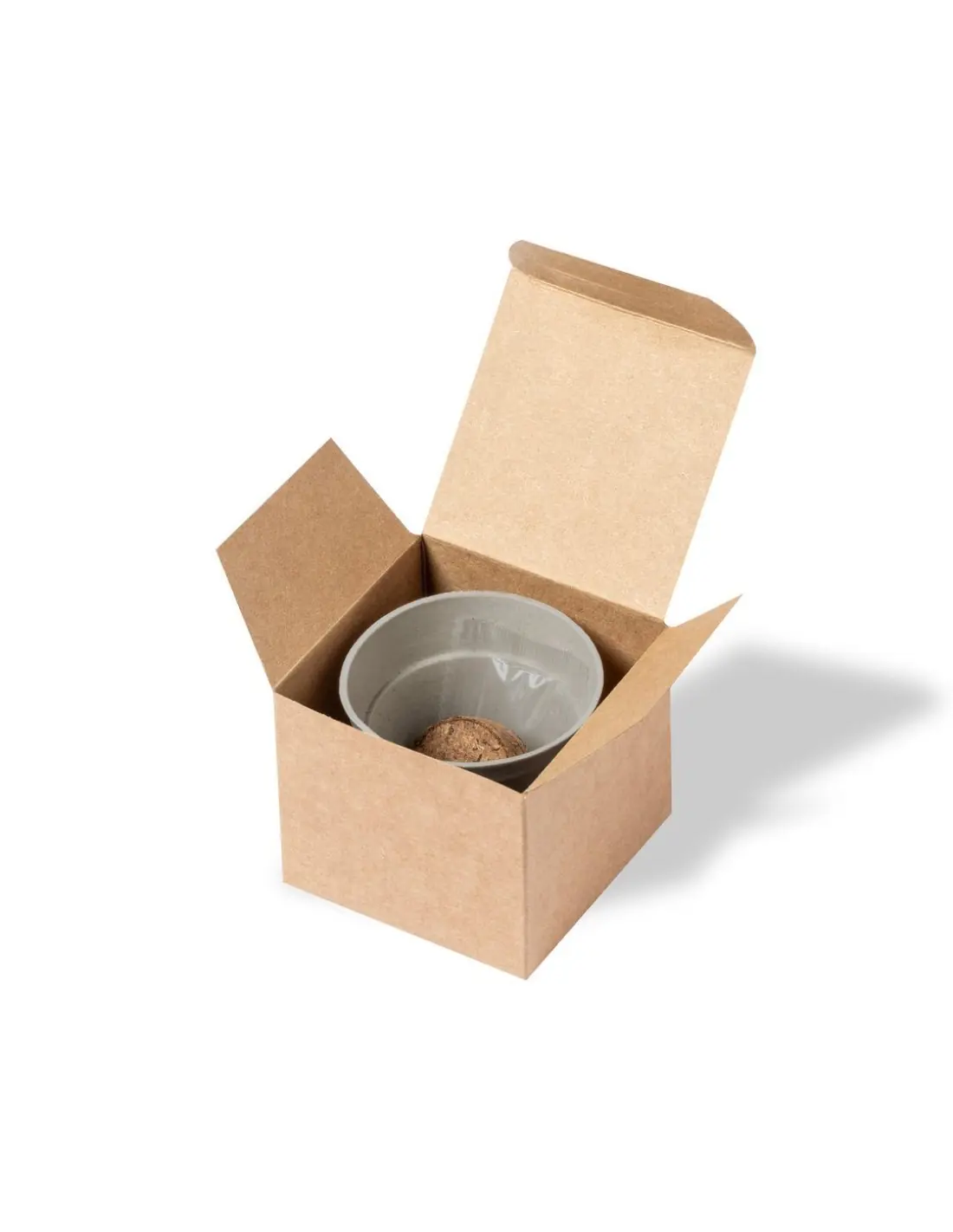 Maceta de línea nature con semillas de girasol. Macetero biodegradable, con 5-8 semillas y pastilla con sustrato de crecimiento. Presentación en caja individual kraft.