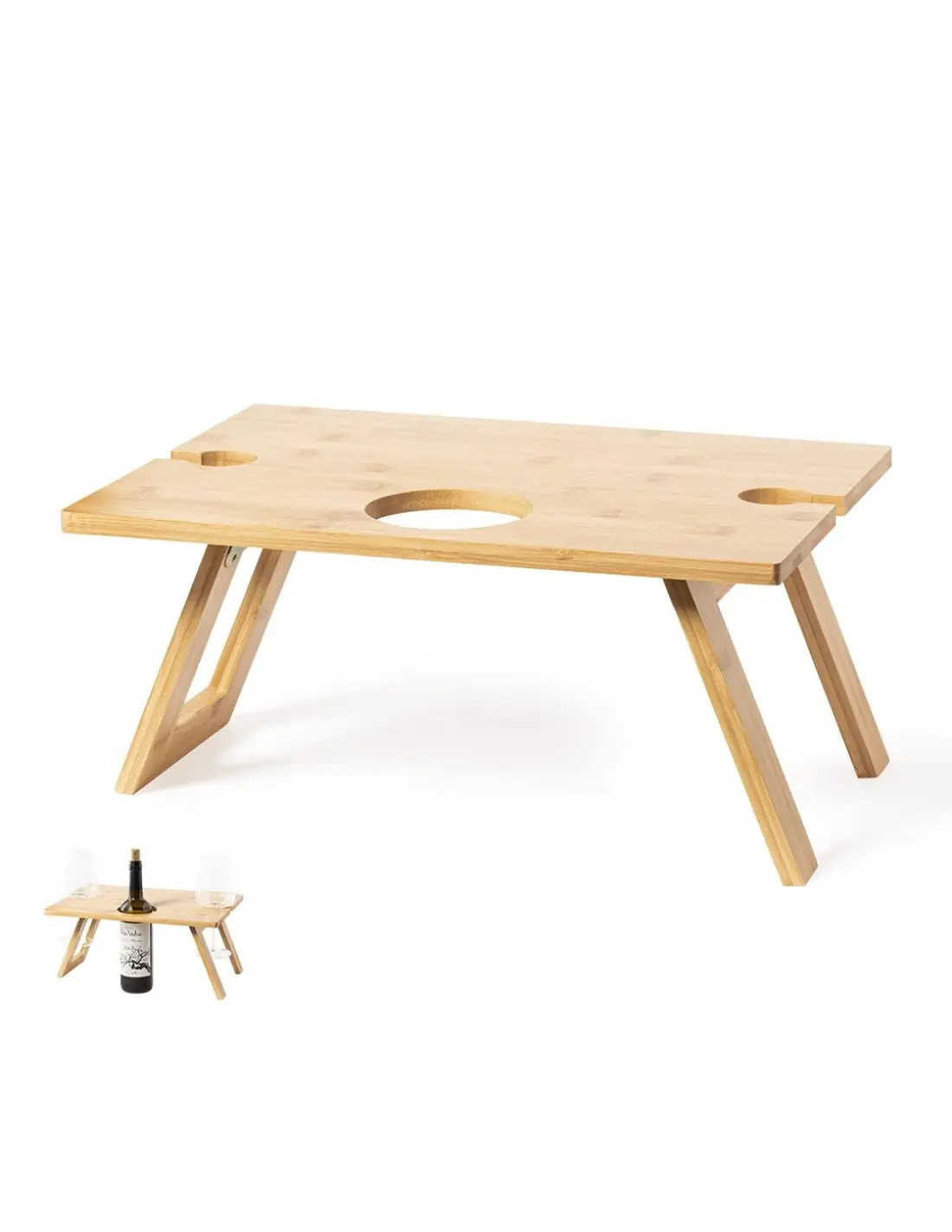 Mesa plegable para los aficionados al mundo del vino. Fabricada en bambú, incluye compartimento para botella de 75cl y 2 soportes para copa. De fácil plegado y tamaño compacto, presentada en atractiva caja individual de diseño eco.
