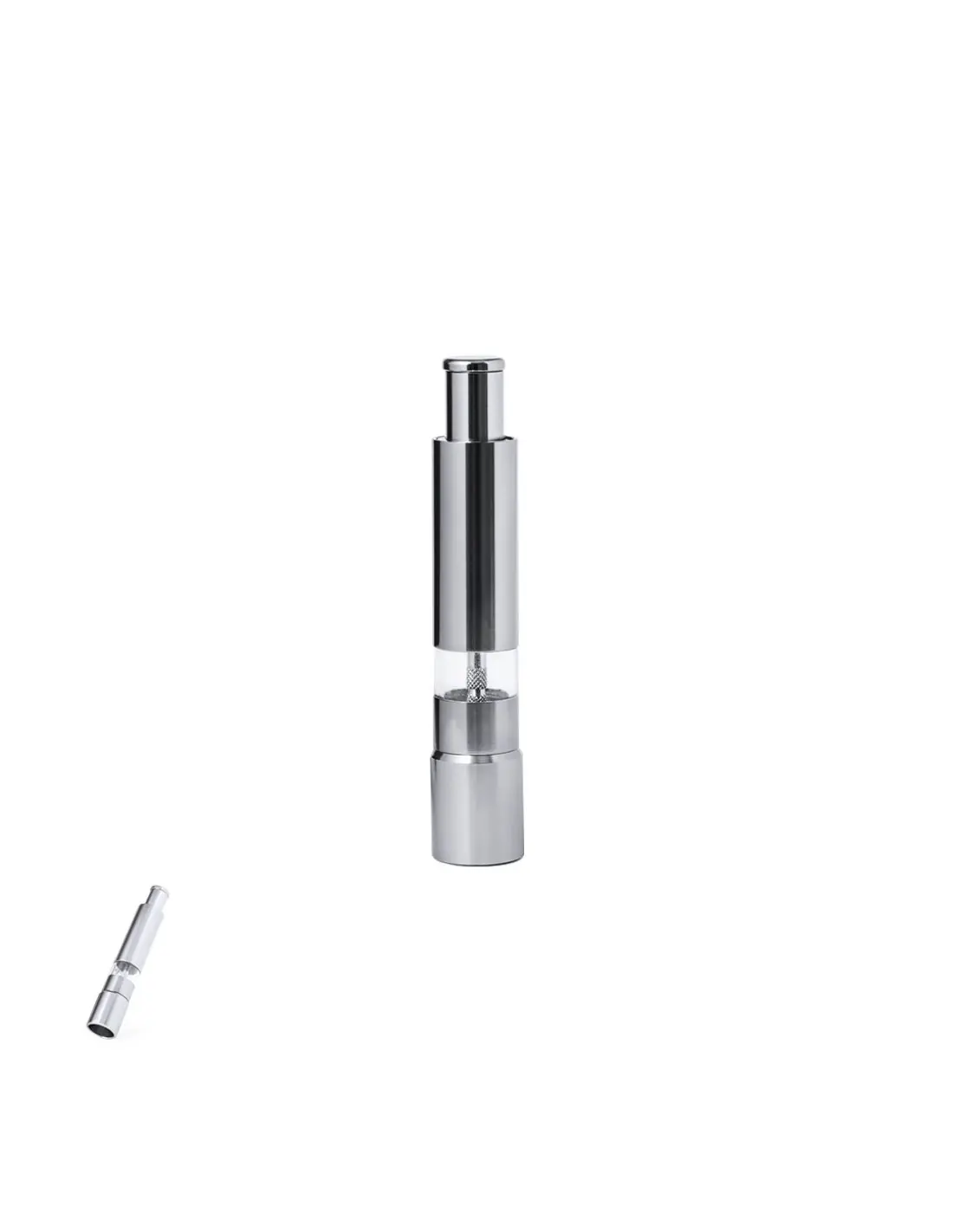 Molinillo manual para sal y pimienta fabricado en aluminio. Ideal para agregar la especia más deseada y utilizar con el picador manual en forma de pulsador. Cuenta con una ventana para visualizar el nivel. Presentado en caja de diseño kraft.