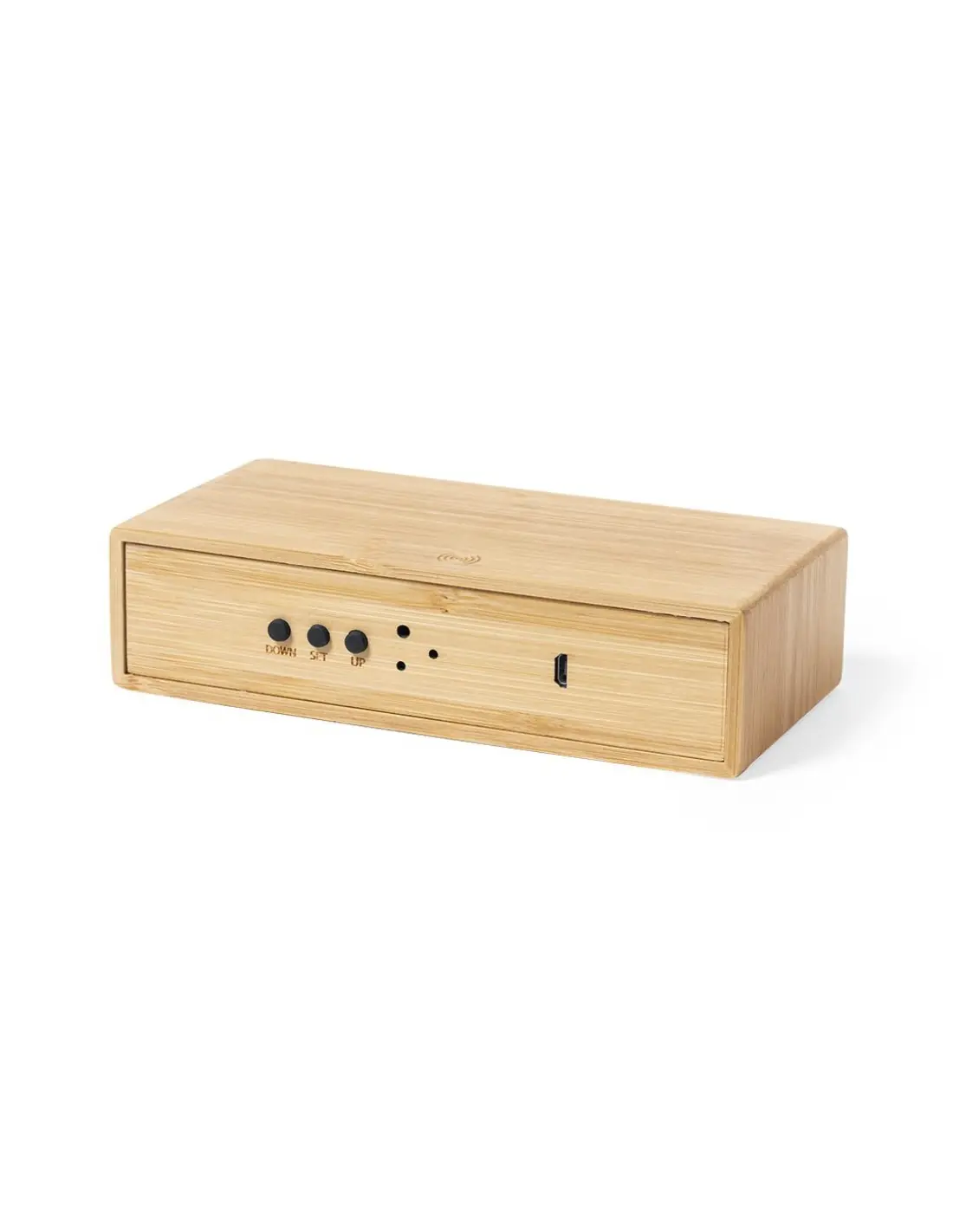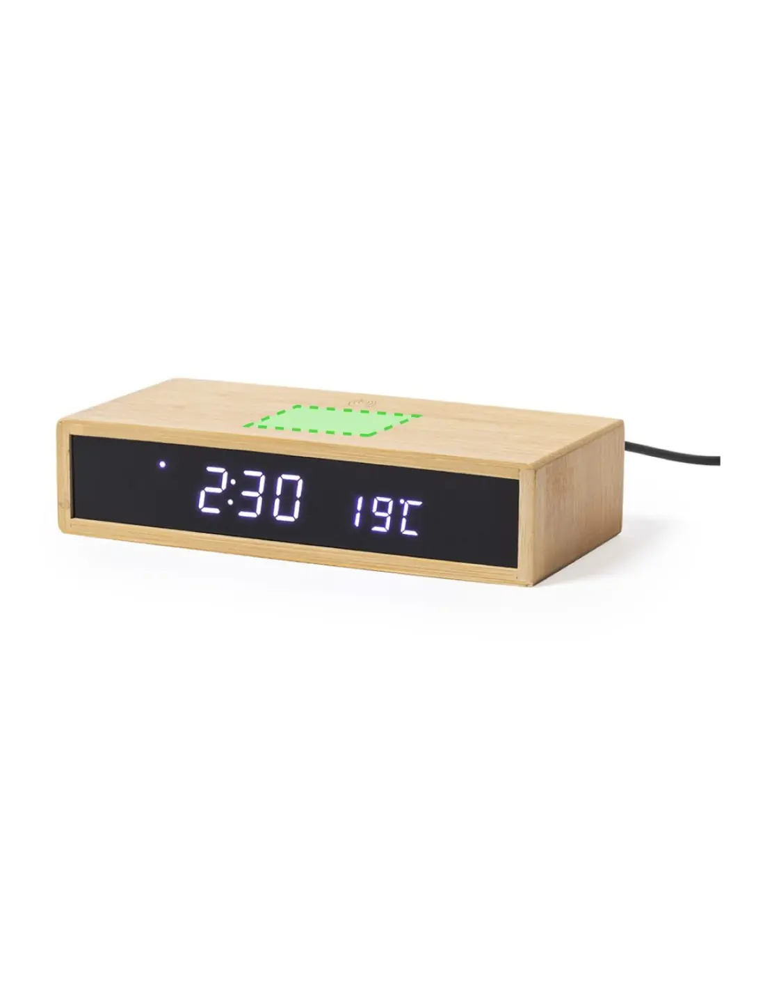 Reloj multifunción de línea nature, con cargador inalámbrico 5W integrado. Fabricado en bambú procedente de cortes naturales. Función fecha y hora, alarma y termómetro. Alimentación mediante conexión USB, con cable micro USB y adaptador de pared incluido. Pila de botón incluida que permite guardar los datos en caso de desconexión. Compatible con dispositivos equipados con tecnología de carga inalámbrica y presentado en atractiva caja de diseño. Disponible manual de instrucciones en español e inglés.