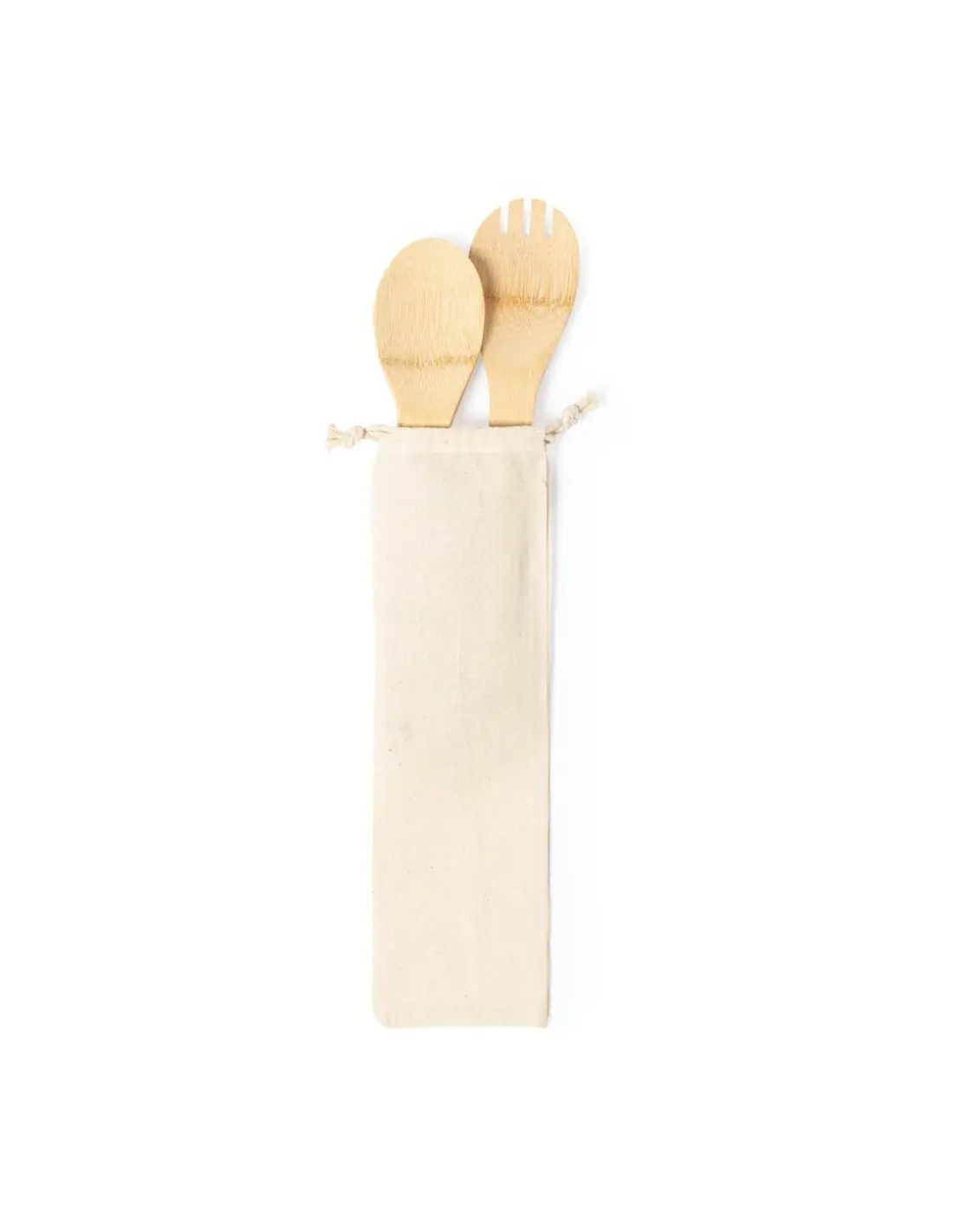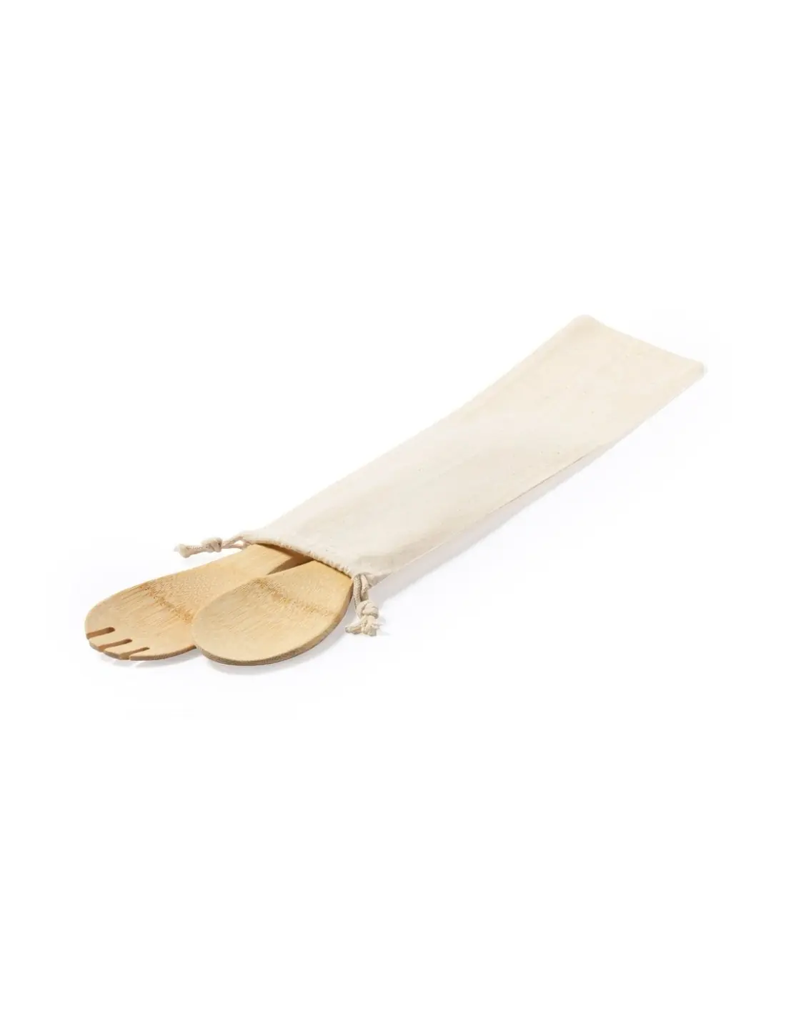 Set para ensalada con 2 utensilios fabricados en resistente bambú. Presentación en funda de algodón natural con cordón de cierre.
