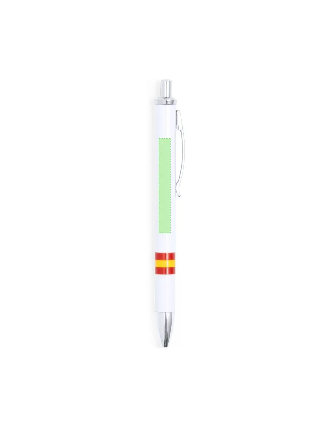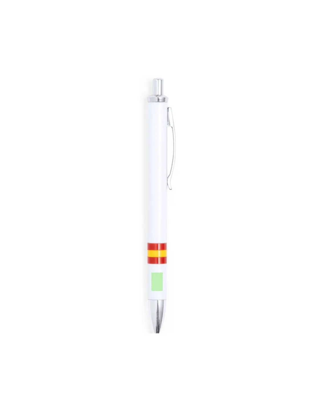 Bolígrafo de mecanismo pulsador de elegante diseño bicolor con accesorios en color plateado brillante y cuerpo de suave acabado en color blanco brillante con la bandera nacional. Con clip metálico, de cartucho jumbo y tinta azul.