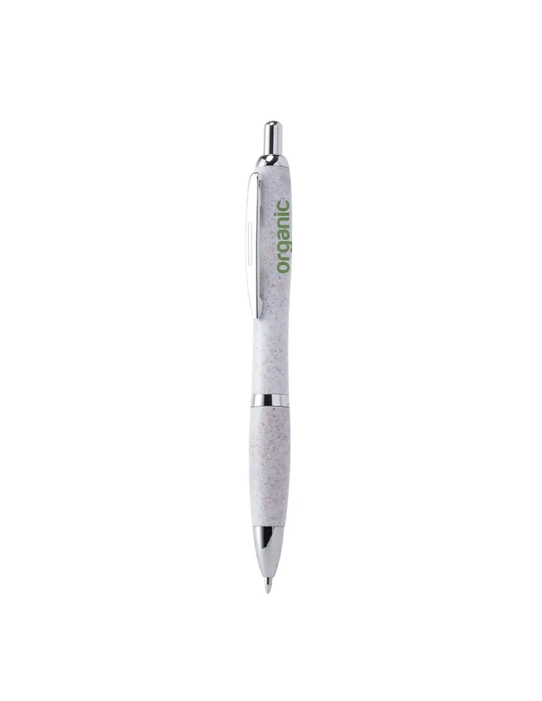 Bolígrafo de línea nature con cuerpo en caña de trigo, para así fomentar la utilización de materias primas naturales y reducir las emisiones contaminantes. De mecanismo pulsador, con detalles cromados y clip troquelado, cartucho jumbo y tinta azul. Disponible en variada gama de colores.