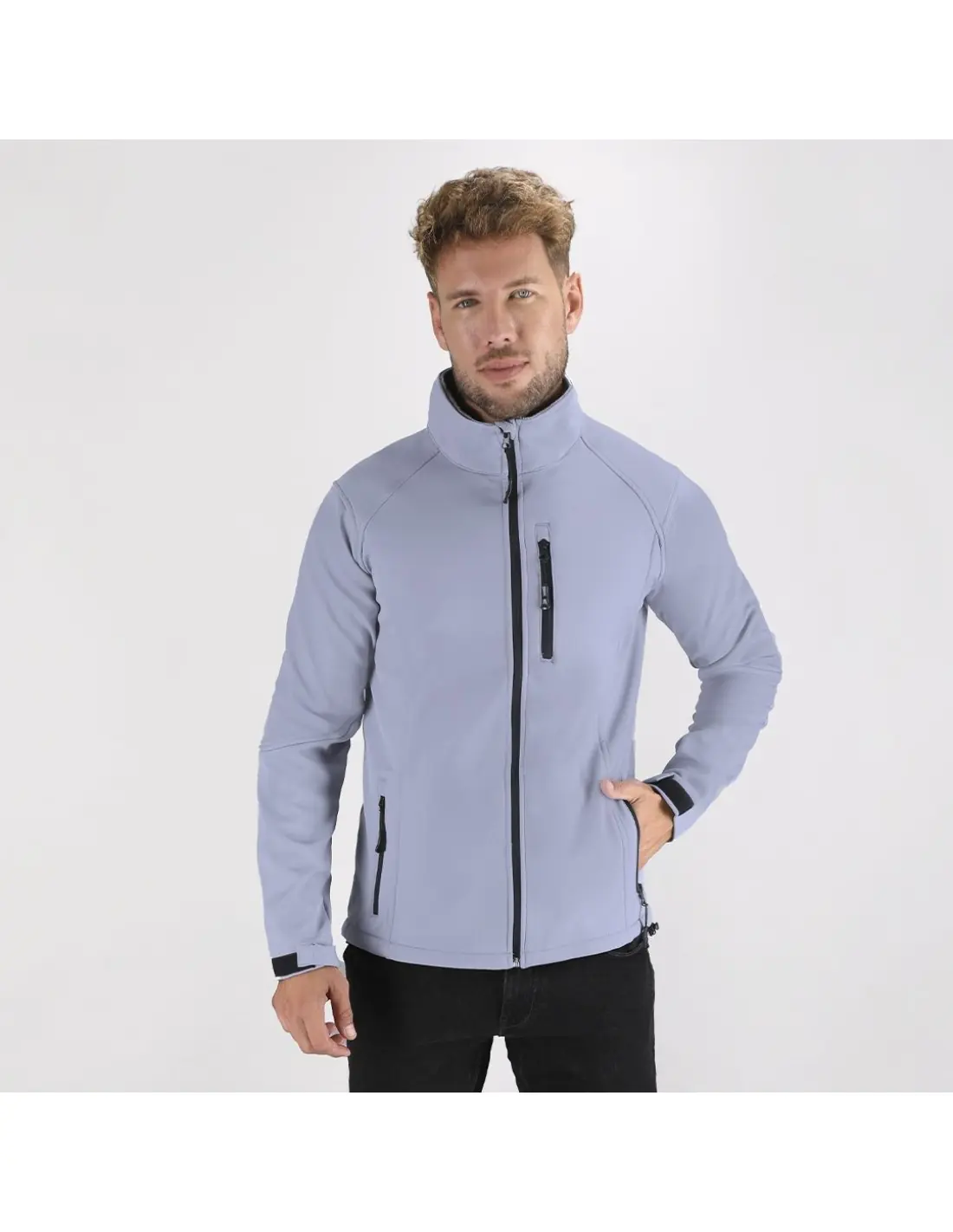 Chaqueta impermeable y transpirable en combinación de materiales soft shell y elastano de 300g/m2. De corte moderno, con cremallera central, bolsillos laterales y práctico bolsillo en pecho con cierres de cremallera y tiradores en elegante color negro, de cuello elevado. Mangas con cómodos puños ajustables en color a juego. Exterior en soft shell resistente al viento y al agua. Disponible en tallas S, M, L, XL, XXL.