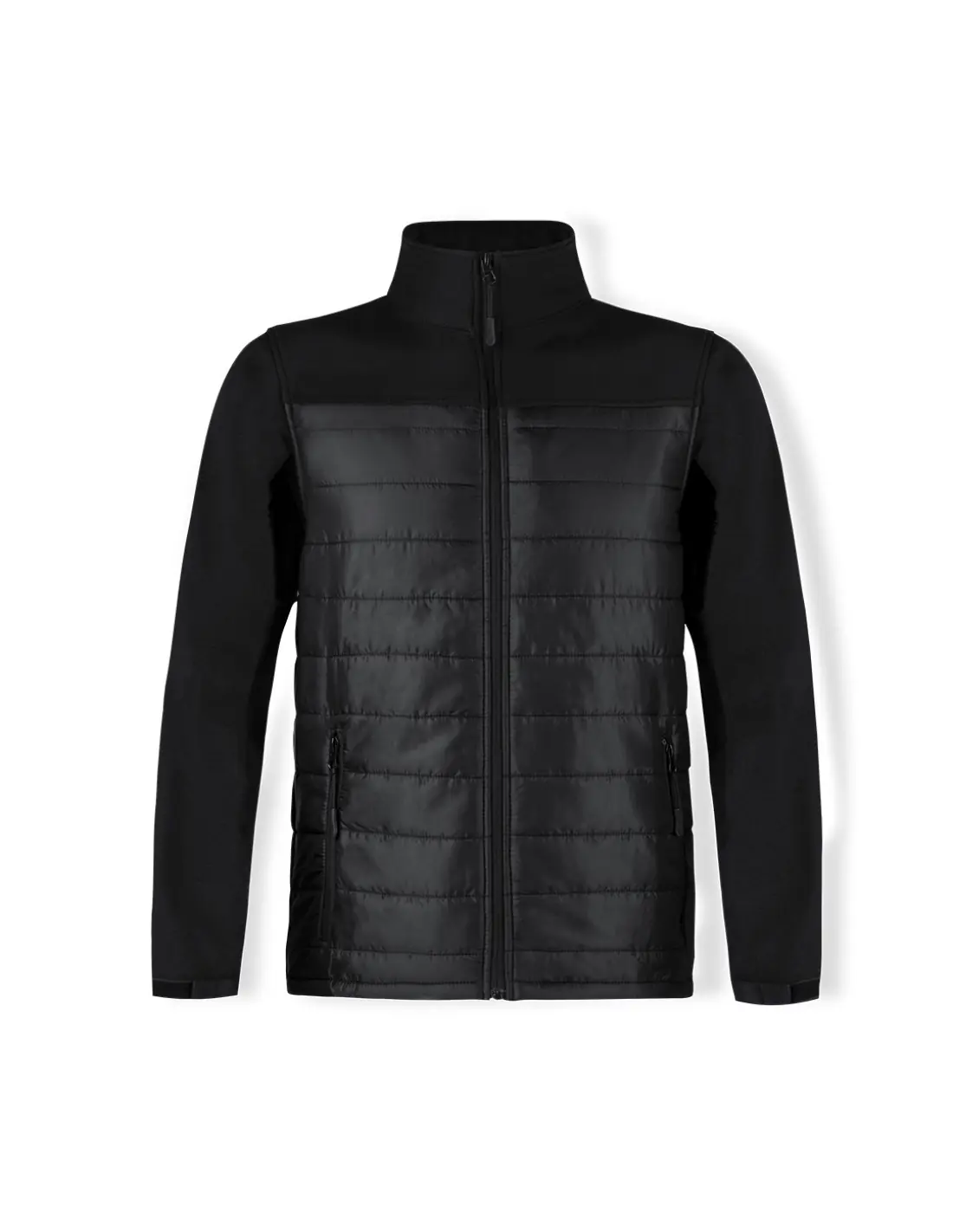 Chaqueta impermeable y transpirable en combinación de materiales soft shell y poliéster. De elegante construcción en color negro, con cierre de cremallera y bolsillos laterales de cremallera con tiradores para fácil apertura. Puños ajustables y disponible en tallas S, M, L, XL, XXL.