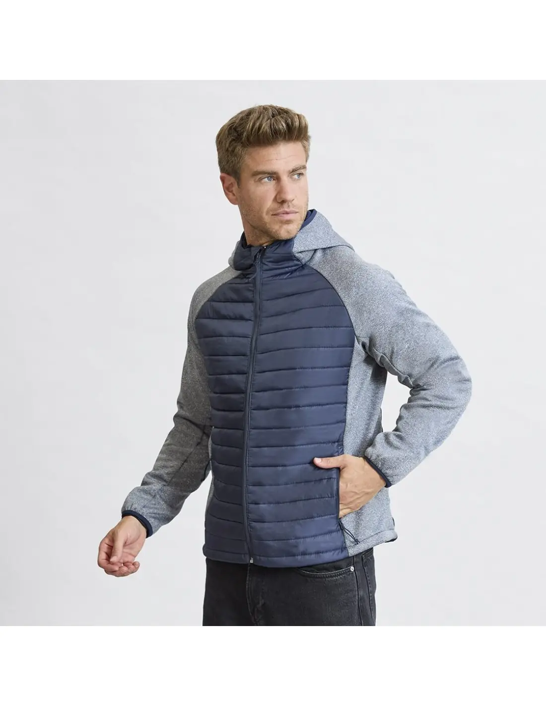 Chaqueta unisex transpirable en combinación de materiales soft shell y poliéster, con tejido acolchado tacto pluma en frontal y espalda. Capucha y manga estilo ranglán con ribete elástico en cuello, puños y bajo . De elegante construcción en combinación de colores negro y gris, resistente al viento y al agua. Cierre de cremallera y bolsillos laterales de cremallera con tiradores para fácil apertura. Disponible en tallas S, M, L, XL, XXL.