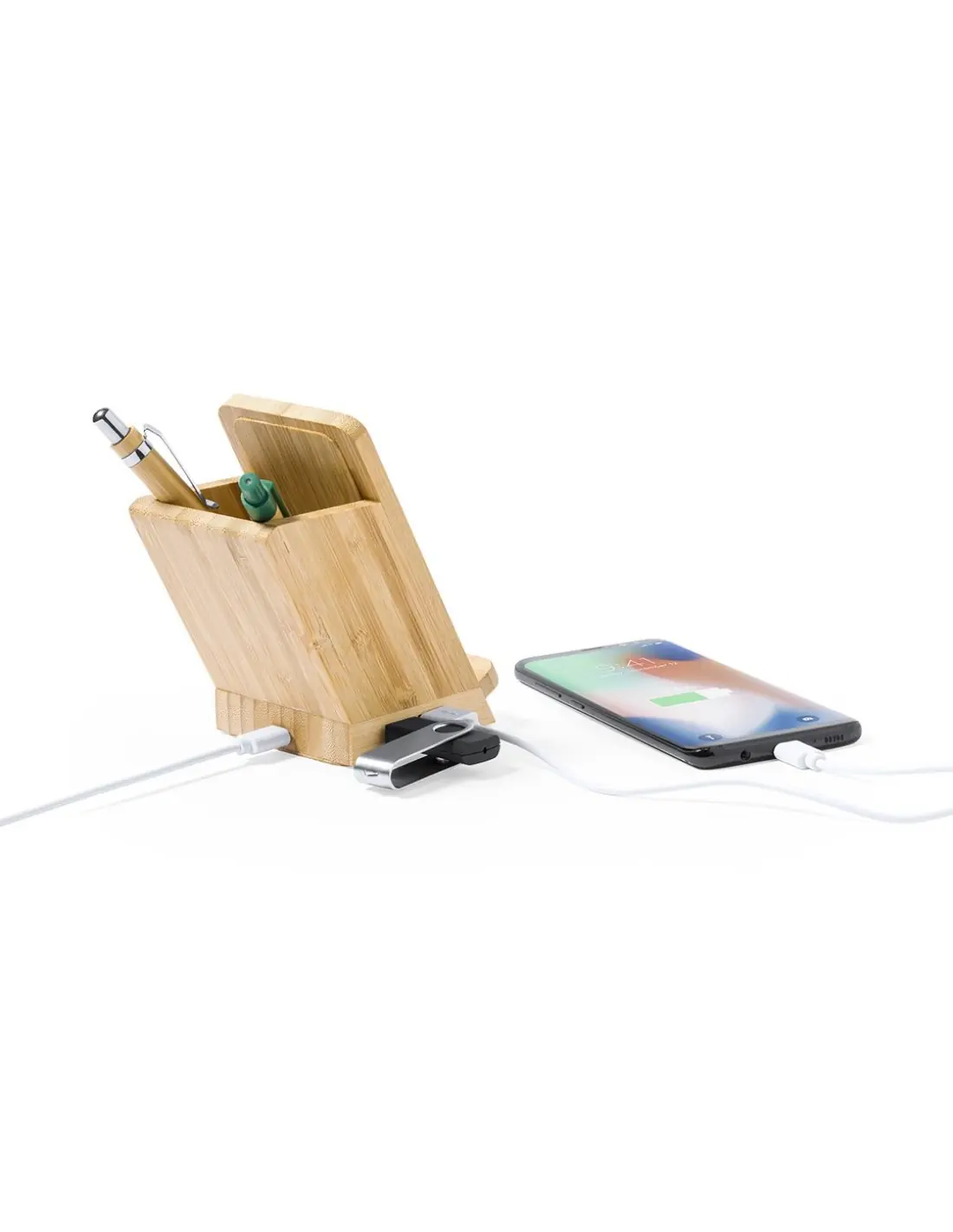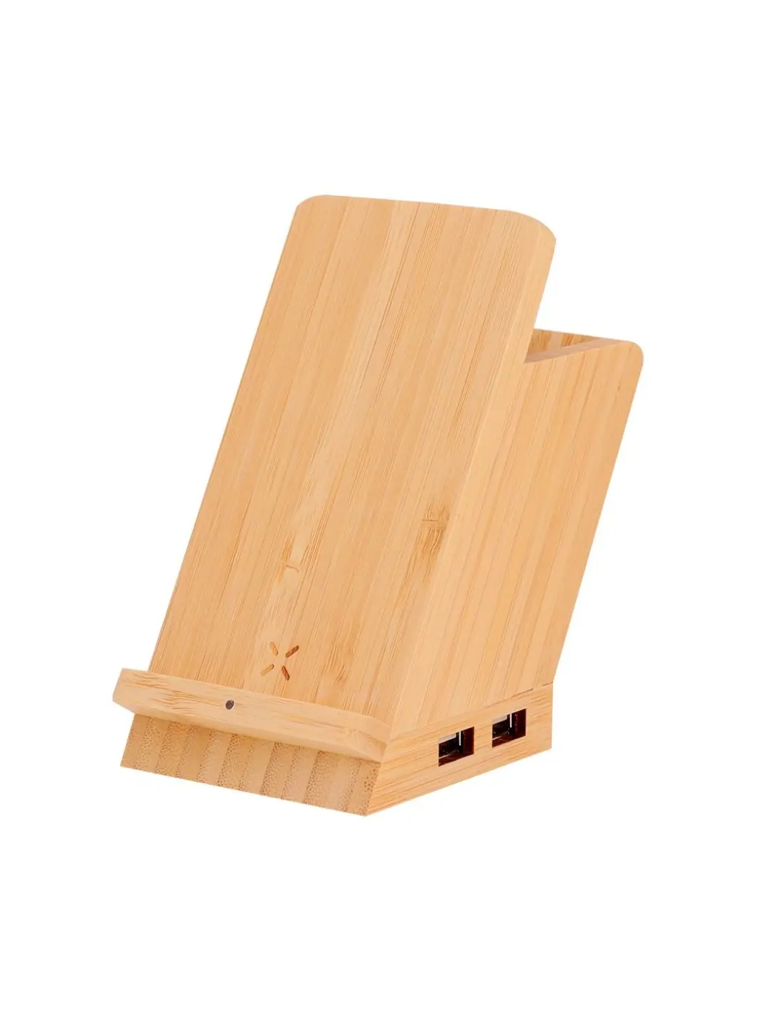 Lapicero multifunción 4 en 1 de línea nature fabricado en bambú. Con funciones lapicero, soporte para smartphone, cargador inalámbrico 5W y puerto USB (4xUSB 2.0). Compatible con smartphones con tecnología de carga inalámbrica. Incluye cable micro USB en color blanco de 1 metro de largo. Presentado en atractiva caja de diseño eco. Disponible manual de instrucciones en español e inglés.
