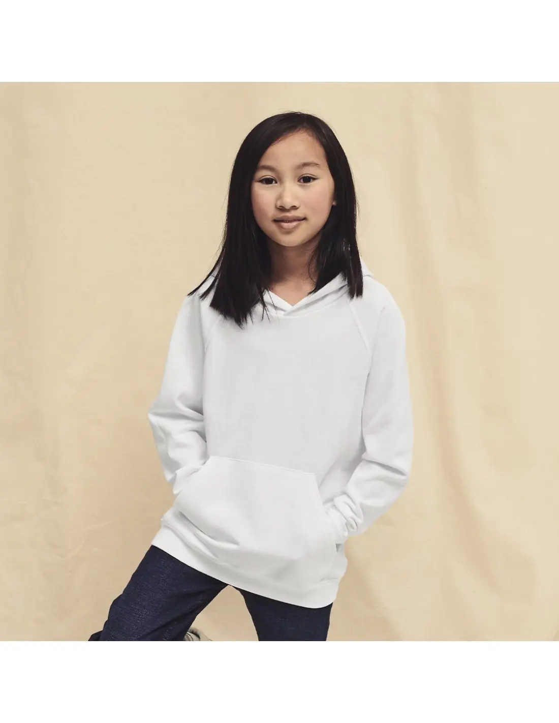 Sudadera unisex para niños Lightweight Hooded Sweat de Fruit Of The Loom. Fabricada en felpa sin cepillar, en combinación de materiales 80% algodón + 20% poliéster de 240g/m2. Capucha sin cordón de ajuste para garantizar la seguridad de los niños y en cumplimiento con la legislación europea de ropa infantil. Manga ranglán y bolsillo frontal tipo canguro, con cintura y puños en algodón/ LYCRA. Disponible en variada gama de colores y en tallas 5-6, 7-8, 9-11, 12-13, 14-15.