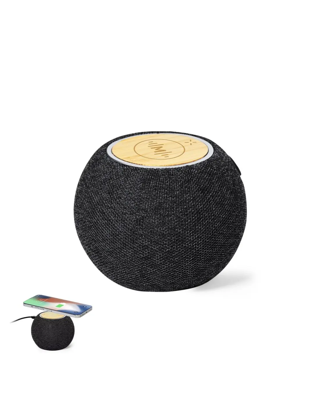 Altavoz multifunción con conexión Bluetooth. Con carga inalámbrica de 15W para dispositivos con tecnología Qi. Carcasa fabricada en bambú y poliéster...
