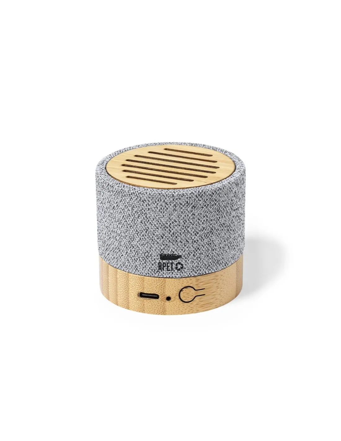 Compacto altavoz de línea nature y conexión Bluetooth. Carcasa fabricada en bambú y poliéster RPET, elaborado a partir de plástico reciclado, para así fomentar la reutilización de residuos plásticos y ayudar a la sostenibilidad del planeta. 3W de potencia, batería de 300 mAh y conexión Bluetooth 5.0. Incluye cable cargador Tipo C y manual de instrucciones en español e inglés. Con distintivo RPET y presentado en caja individual de diseño kraft.