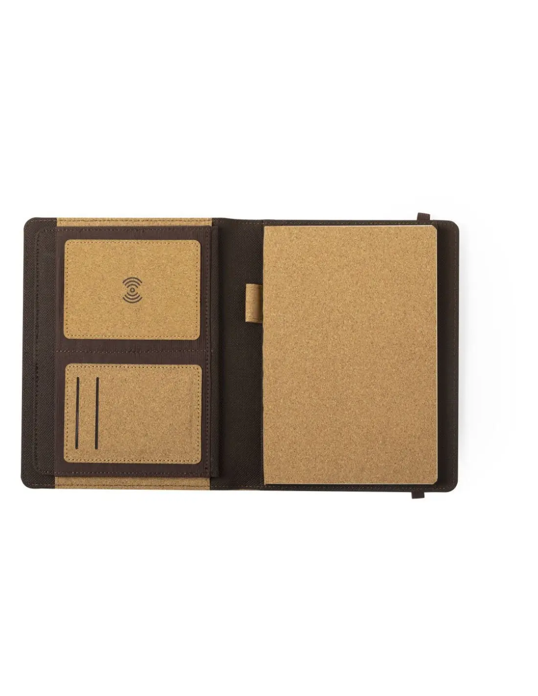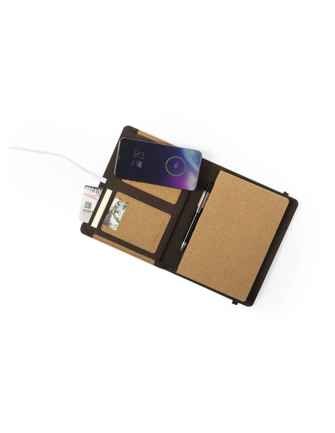 Bloc de notas de línea nature con cargador inalámbrico integrado. Cubiertas en corcho natural, de sobrio diseño y con original estación de carga en la contraportada. Compatible con dispositivos equipados con tecnología de carga inalámbrica. Bloc de 64 hojas con disposición a una raya. Incluye cable cargador micro USB y viene presentado en una atractiva caja de diseño eco.