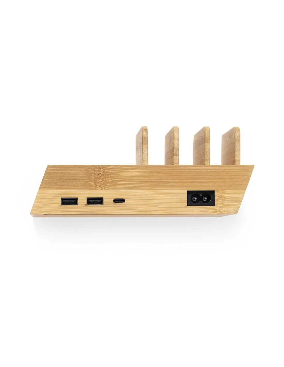Estación de carga inalámbrica de línea nature, multidispositivo y de carga 10W, capaz de cargar simultáneamente hasta 4 dispositivos. Fabricada en bambú. Incluye 2 salidas USB y 1 salida Tipo C compatible con dispositivos equipados con tecnología de carga inalámbrica. Cable de conexión de 150 cm con clavija europea, con amplia superficie de marcaje y presentado en atractiva caja de diseño eco. Disponible manual de instrucciones en español e inglés. En cumplimiento con los requisitos de seguridad: Sistema de protección contra sobrecalentamiento.Sistema de protección contra sobrecarga.Sistema de bloqueo para evitar cortocircuitos.