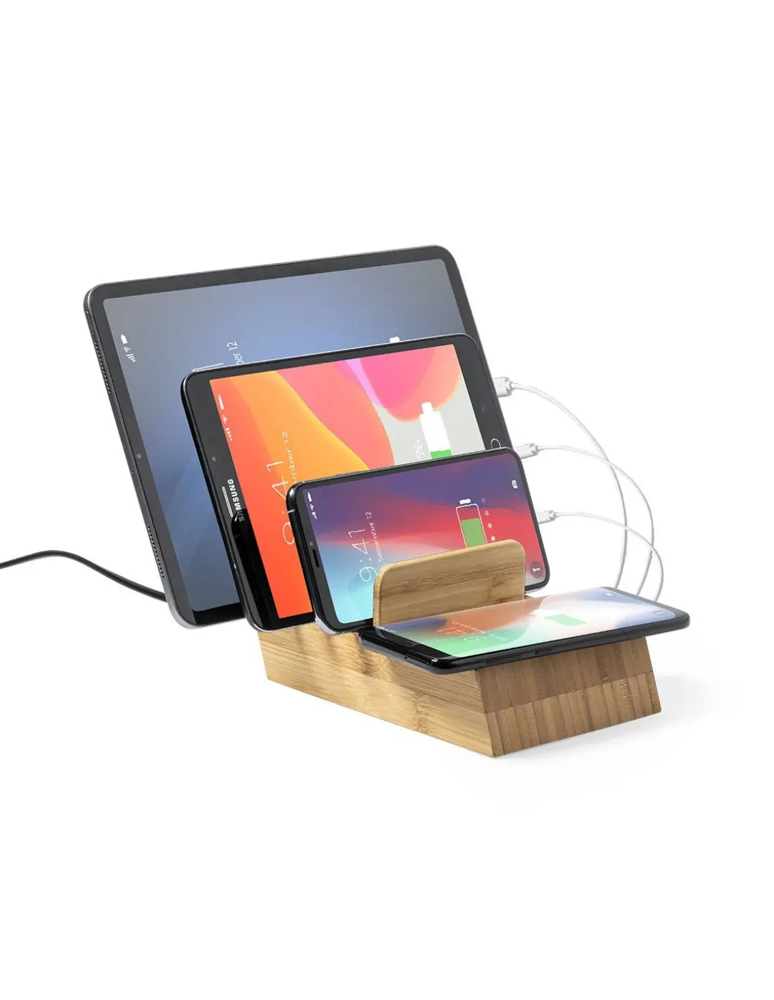 Estación de carga inalámbrica de línea nature, multidispositivo y de carga 10W, capaz de cargar simultáneamente hasta 4 dispositivos. Fabricada en...