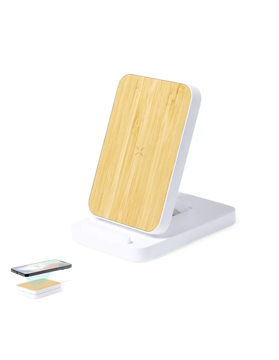 Cargador inalámbrico plegable 15W. Con base fabricada en resistente ABS de color blanco y superficie de carga en bambú, con soporte telescópico...