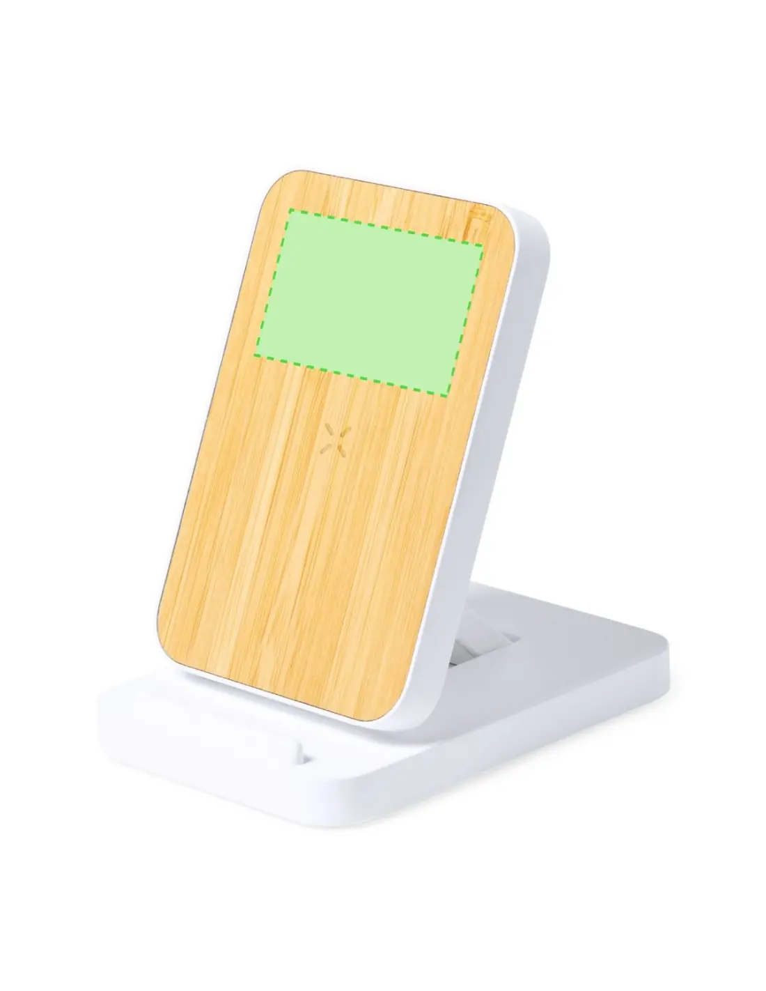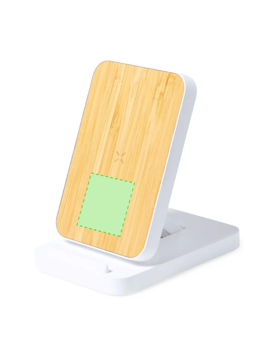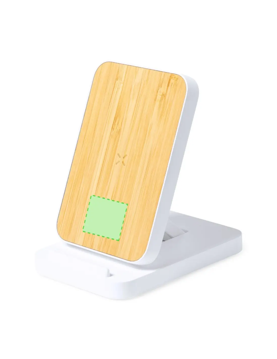 Cargador inalámbrico plegable 15W. Con base fabricada en resistente ABS de color blanco y superficie de carga en bambú, con soporte telescópico integrado. Compatible con dispositivos equipados con tecnología de carga inalámbrica Qi, con cable de carga Tipo C incluido. Presentado en caja individual de diseño kraft, con manual de instrucciones en español e inglés. Fabricado conforme a los estándares RoHS y en cumplimiento con los siguientes requisitos de seguridad: Sistema de protección contra sobrecalentamiento. Sistema de protección contra sobrecarga. Sistema de bloqueo para evitar cortocircuitos.