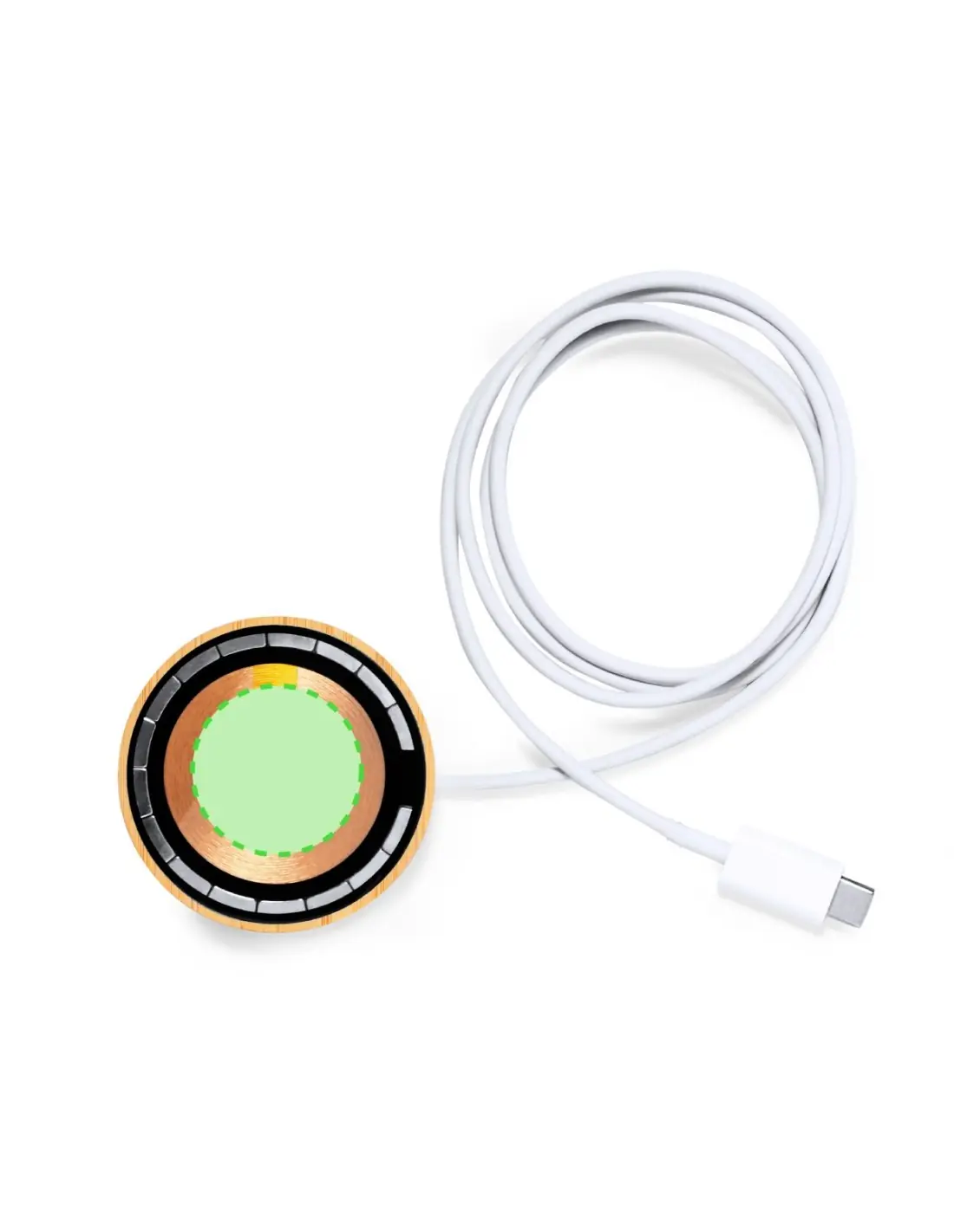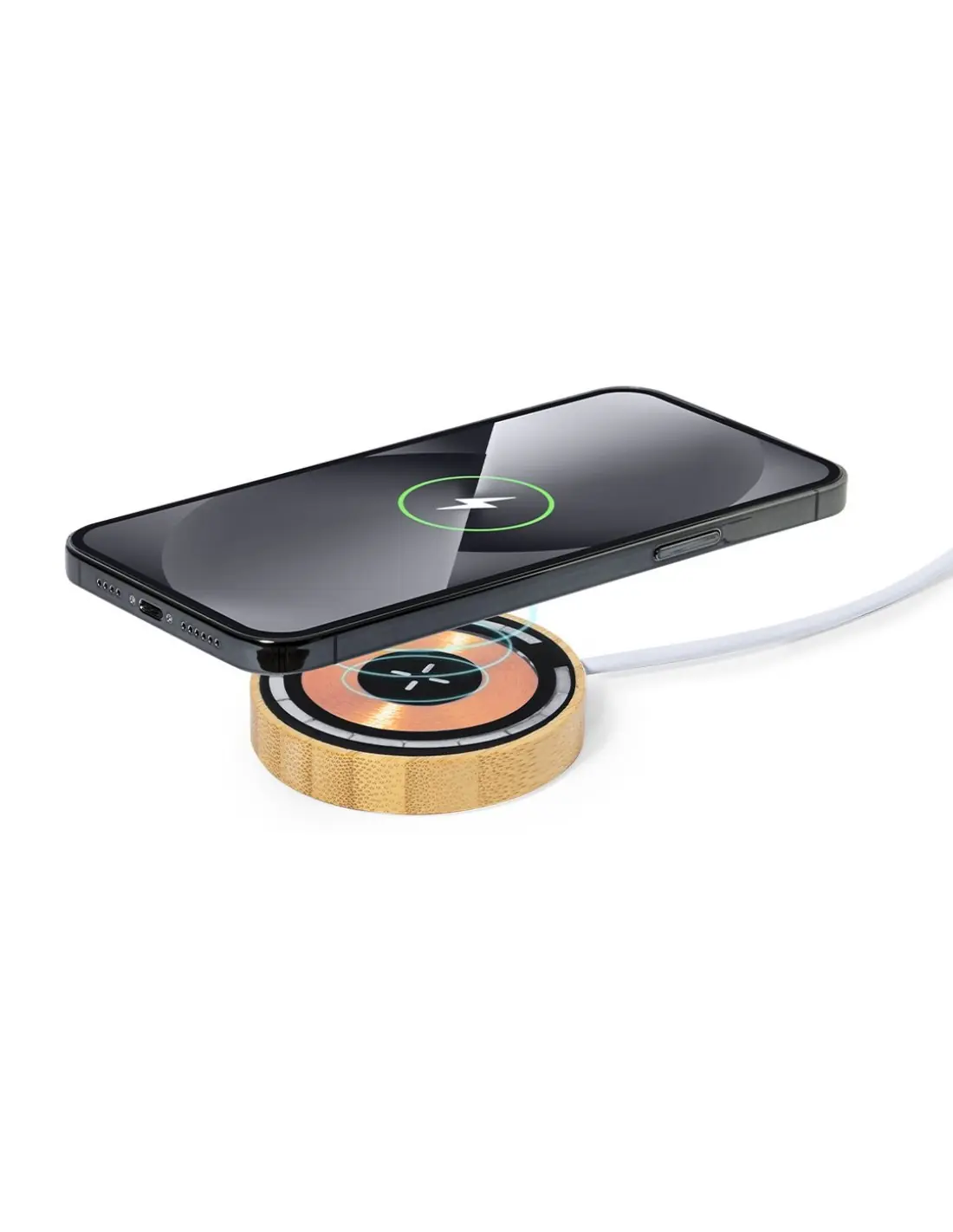 Cargador inalámbrico 15W, de original diseño con una superficie transparente que permite ver los componentes internos del dispositivo. Con base de bambú y fijación magnética Magsafe, compatible con dispositivos equipados con tecnología de carga inalámbrica Qi. Conexión Tipo C, con manual de instrucciones en español e inglés. Presentado en caja individual de diseño kraft.Materiales como el bambú fomentan la utilización de materias primas naturales, reduciendo las emisiones contaminantes. Proviene de una planta de gran resistencia y versatilidad, con crecimiento y regeneración rápidos, siendo una excelente alternativa al uso de madera tradicional.Fabricado conforme a los estándares RoHS y en cumplimiento con los siguientes requisitos de seguridad:Sistema de protección contra sobrecalentamiento.Sistema de protección contra sobrecarga.Sistema de bloqueo para evitar cortocircuitos.