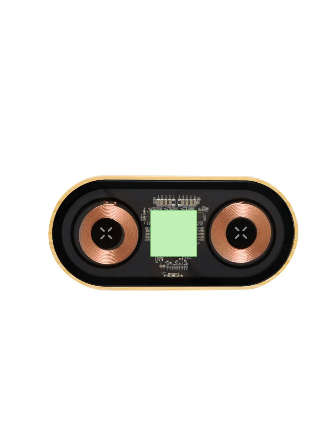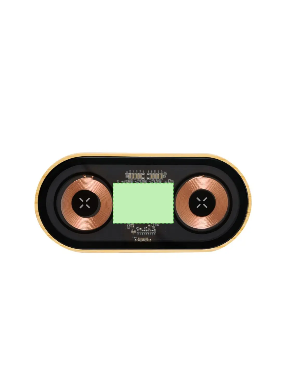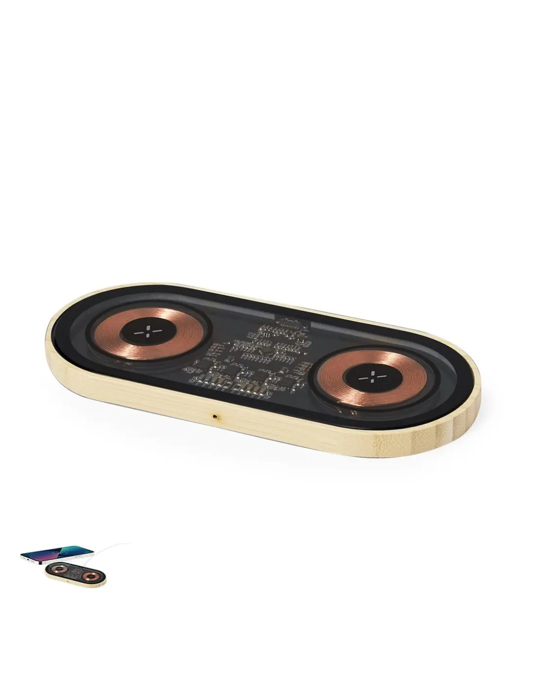 Cargador inalámbrico doble de 15W de original diseño y superficie transparente que permite ver los componentes internos del dispositivo. Con base de bambú, compatible con dispositivos con tecnología Qi, y que además permite cargar dos dispositivos simultáneamente. Conexión Tipo C, con instrucciones de uso en español e inglés. Presentado en caja individual de diseño kraft.Materiales como el bambú fomentan la utilización de materias primas naturales, reduciendo las emisiones contaminantes. Proviene de una planta de gran resistencia y versatilidad, con crecimiento y regeneración rápidos, siendo una excelente alternativa al uso de madera tradicional.Fabricado conforme a los estándares RoHS y en cumplimiento con los siguientes requisitos de seguridad:Sistema de protección contra sobrecalentamiento.Sistema de protección contra sobrecarga.Sistema de bloqueo para evitar cortocircuitos.
