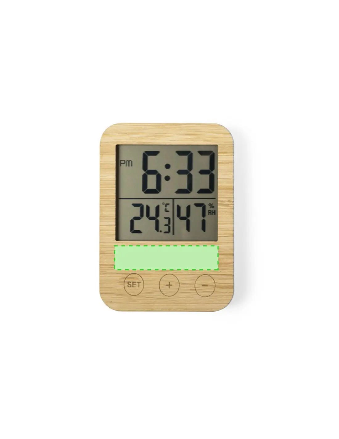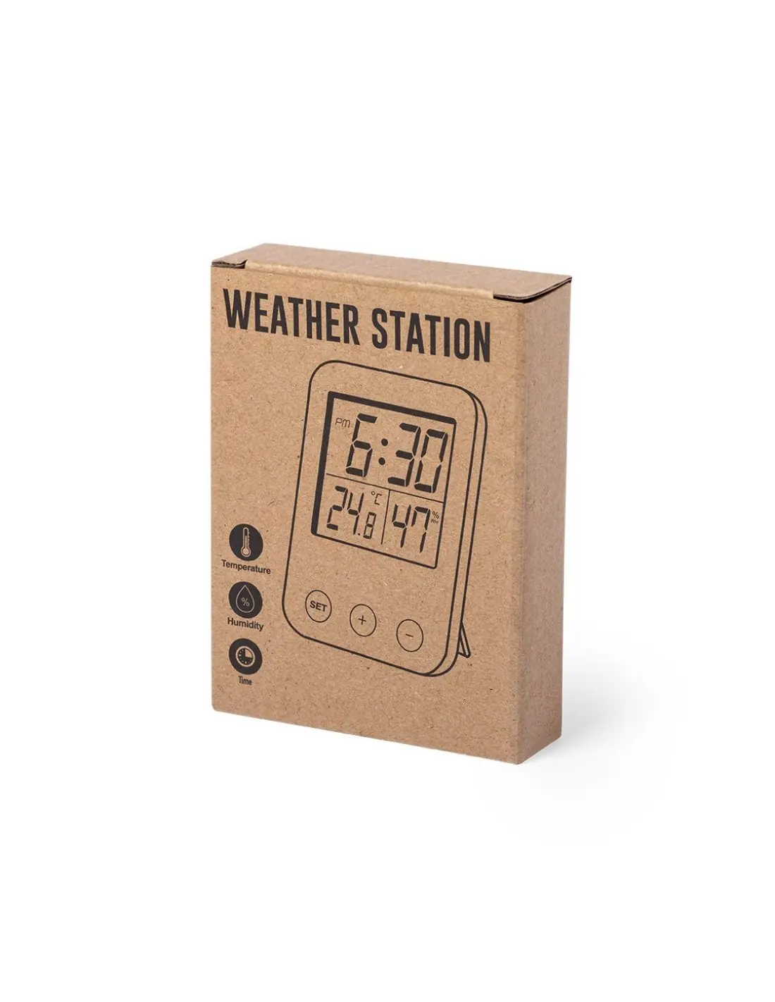 Estación meteorológica de línea nature con frontal en bambú. Funciones higrómetro y termómetro. Alimentación a pilas (2xAAA no incluidas) y presentado en atractiva caja de diseño eco.