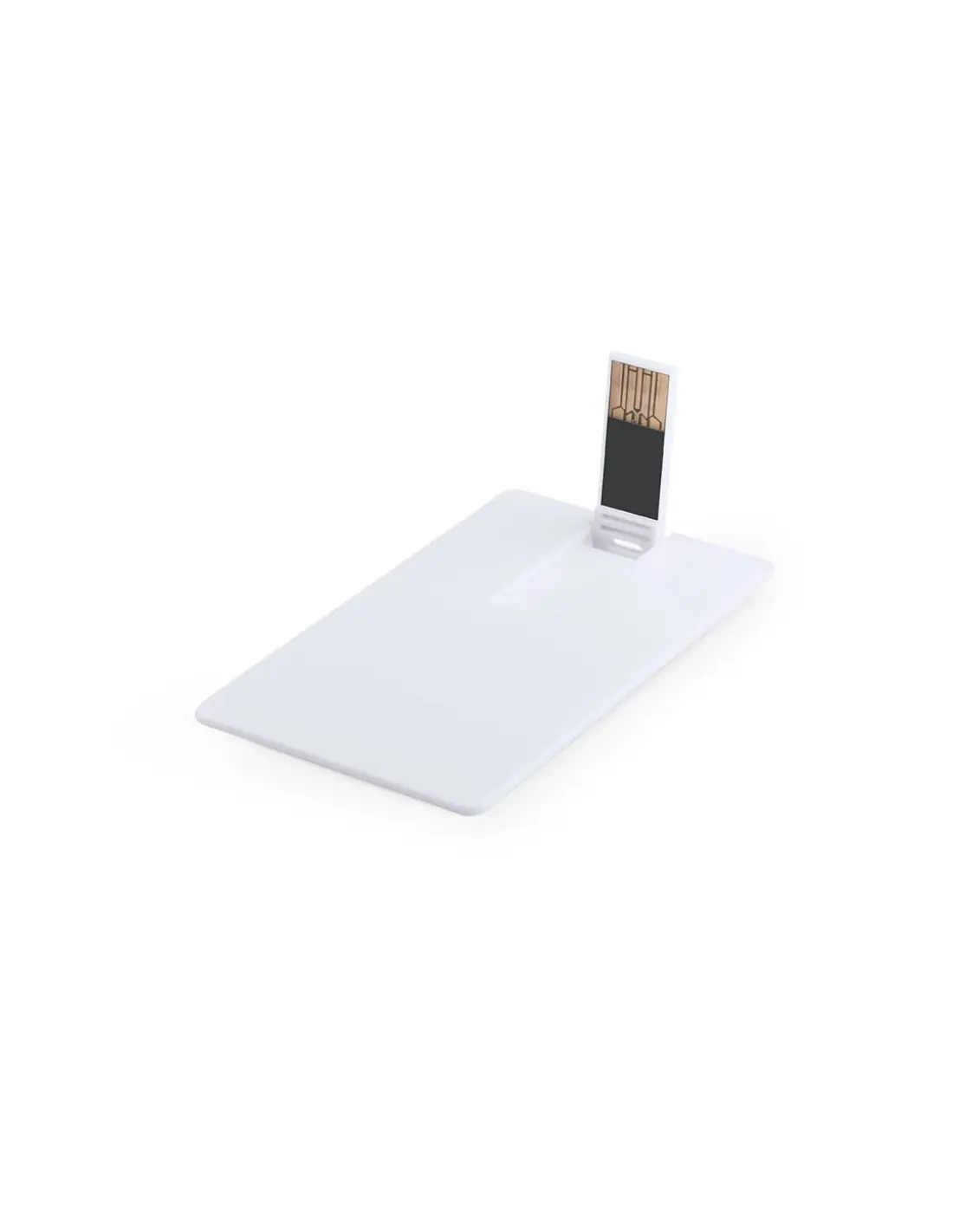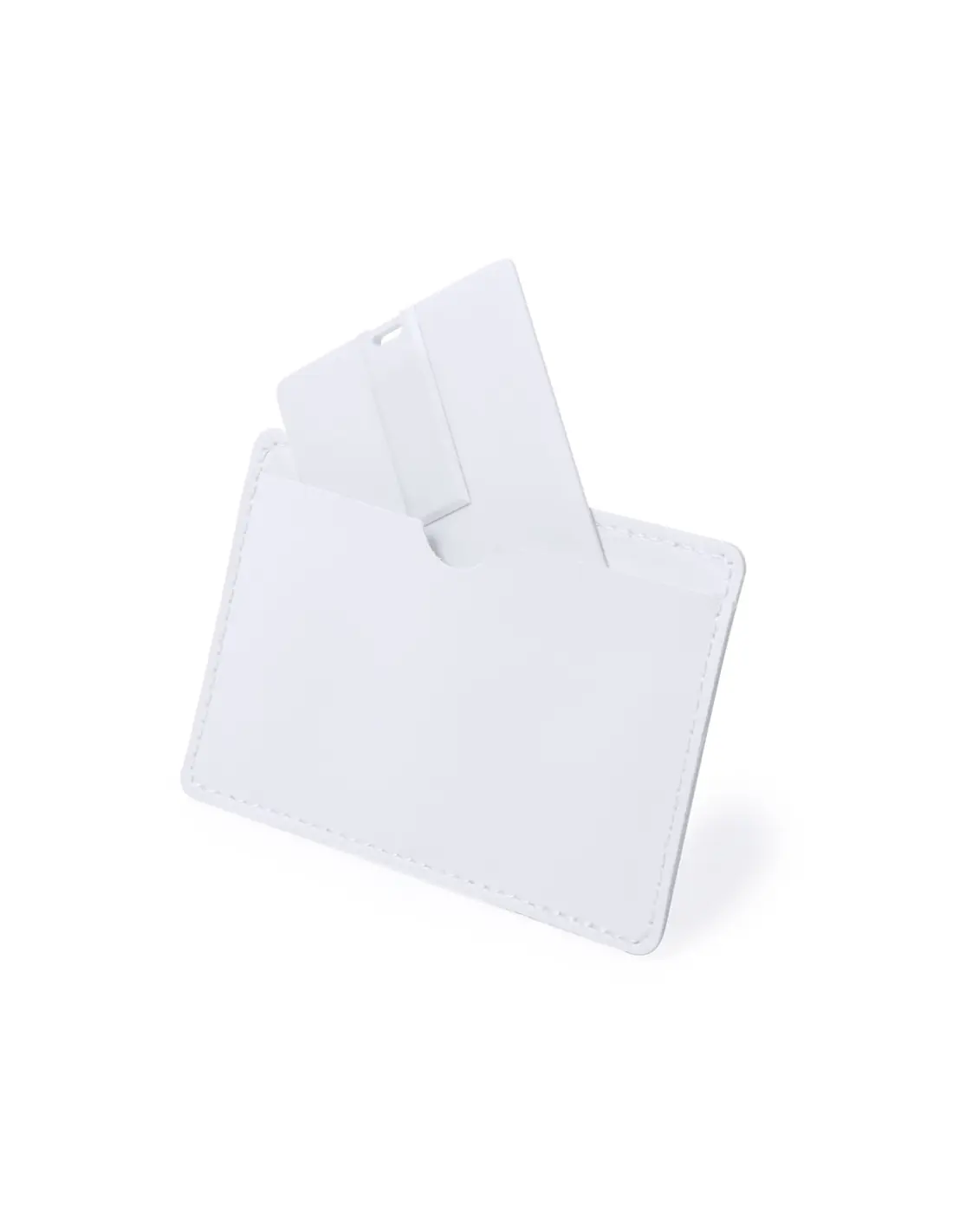 Memoria USB tarjeta de 16GB de capacidad. De diseño ultraplano, mecanismo plegable y especialmente diseñada para marcaje a todo color en digital. Presentada en elegante funda individual de polipiel blanca.