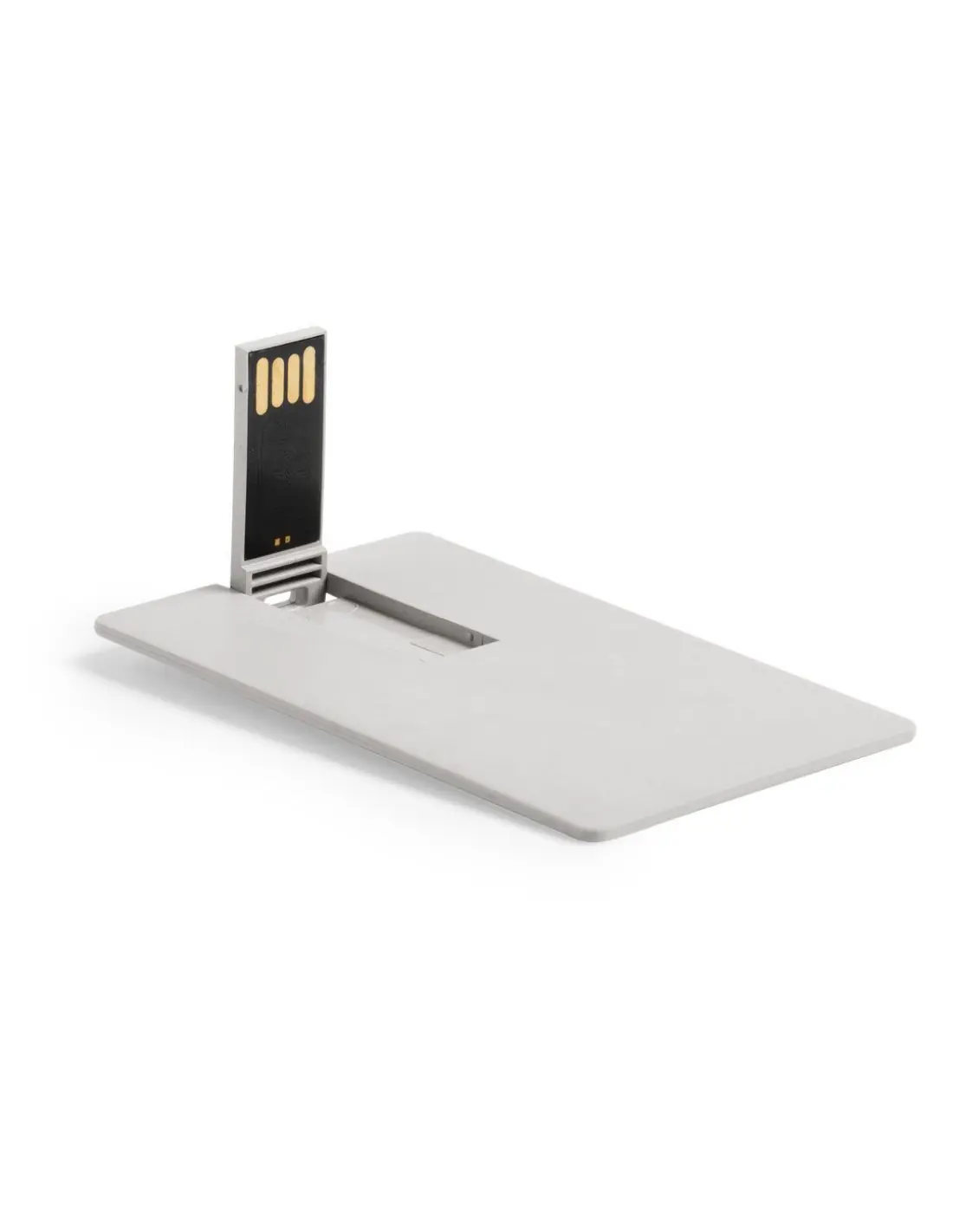 Memoria USB tarjeta de 16GB de capacidad en línea nature. De diseño extra plano en caña de trigo, para así fomentar la utilización de materias primas naturales y reducir las emisiones contaminantes. Con mecanismo plegable y presentada en atractiva caja de diseño eco.