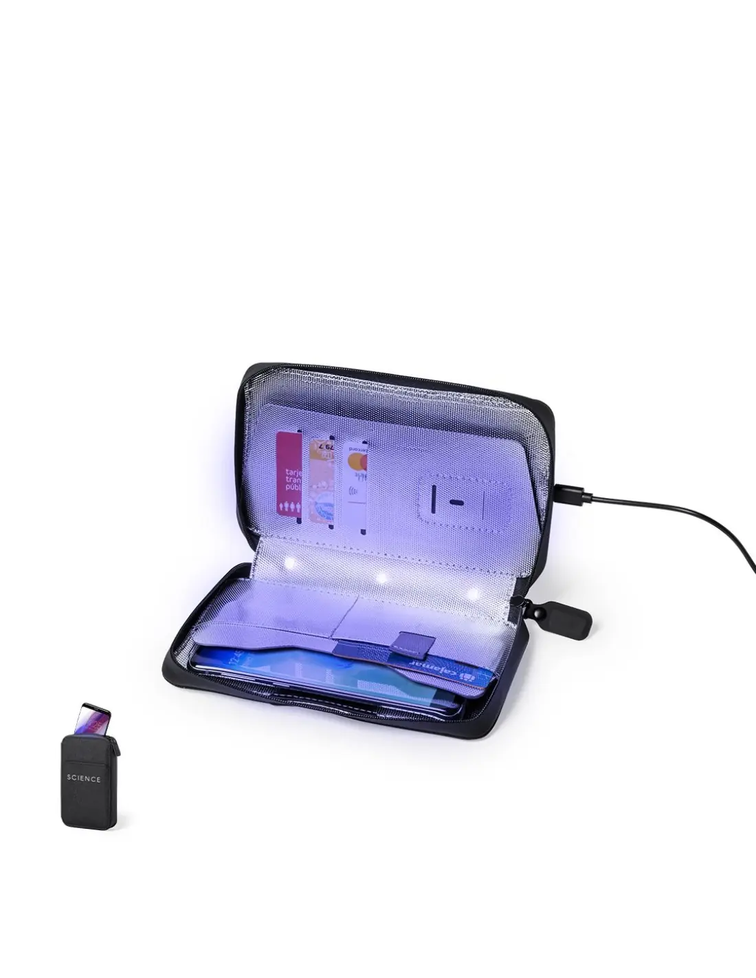 Organizador y esterilizador de luz ultravioleta tipo C, con protección RFID (Identificación por Radio Frecuencia) que mantiene seguros tus dispositivos de transmisión de identidad. Especialmente diseñado para la eliminación de microorganismos y bacterias en smartphones y otros objetos de uso cotidiano. Fabricada en resistente poliéster 600D de acabado denim, con cierre magnético de seguridad en tirador para un uso seguro del dispositivo. Incluye 4 tarjeteros interiores + bolsillo exterior. Presentado en atractiva caja individual de diseño. Potencia LED 1.2W y longitud de onda 275nm. Tiempo de esterilización con función auto-apagado de 1 y 3 minutos. Disponible manual de usuario en español e inglés. Disponible certificación CE, RoHS y de efectividad germicida. Para un uso adecuado del producto, evitar el contacto con la piel y los ojos.
